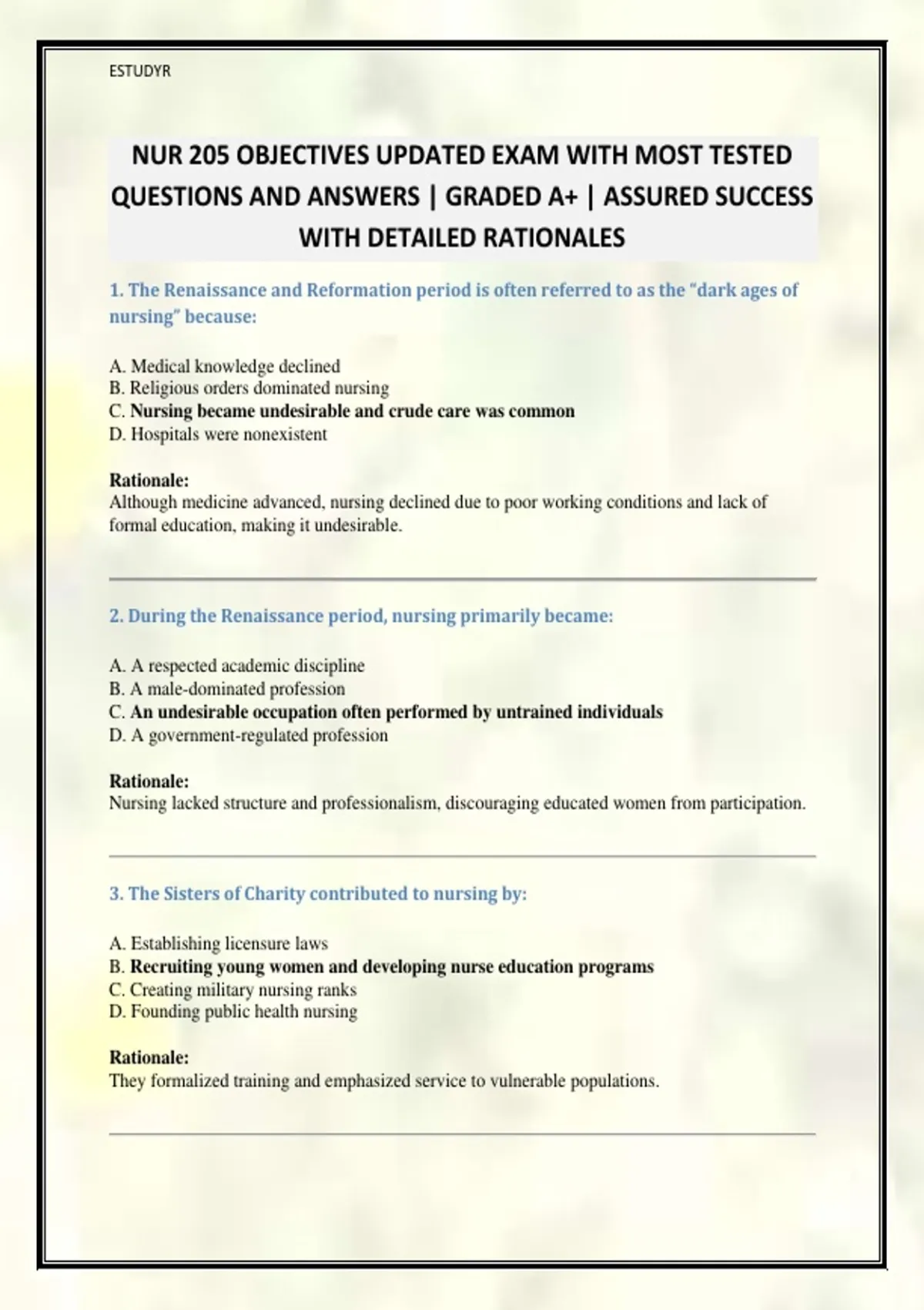 NUR 205 OBJECTIVES UPDATED EXAM WITH MOST TESTED