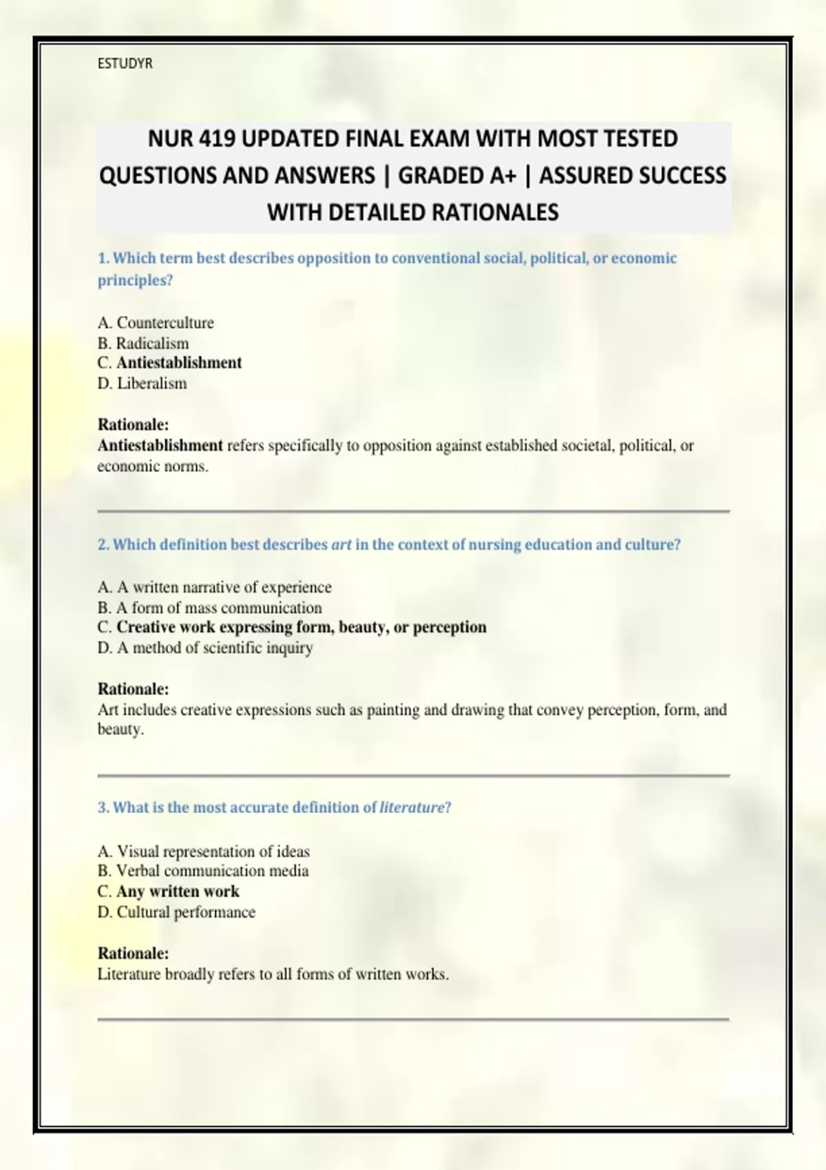 NUR 419 UPDATED FINAL EXAM WITH MOST TESTED