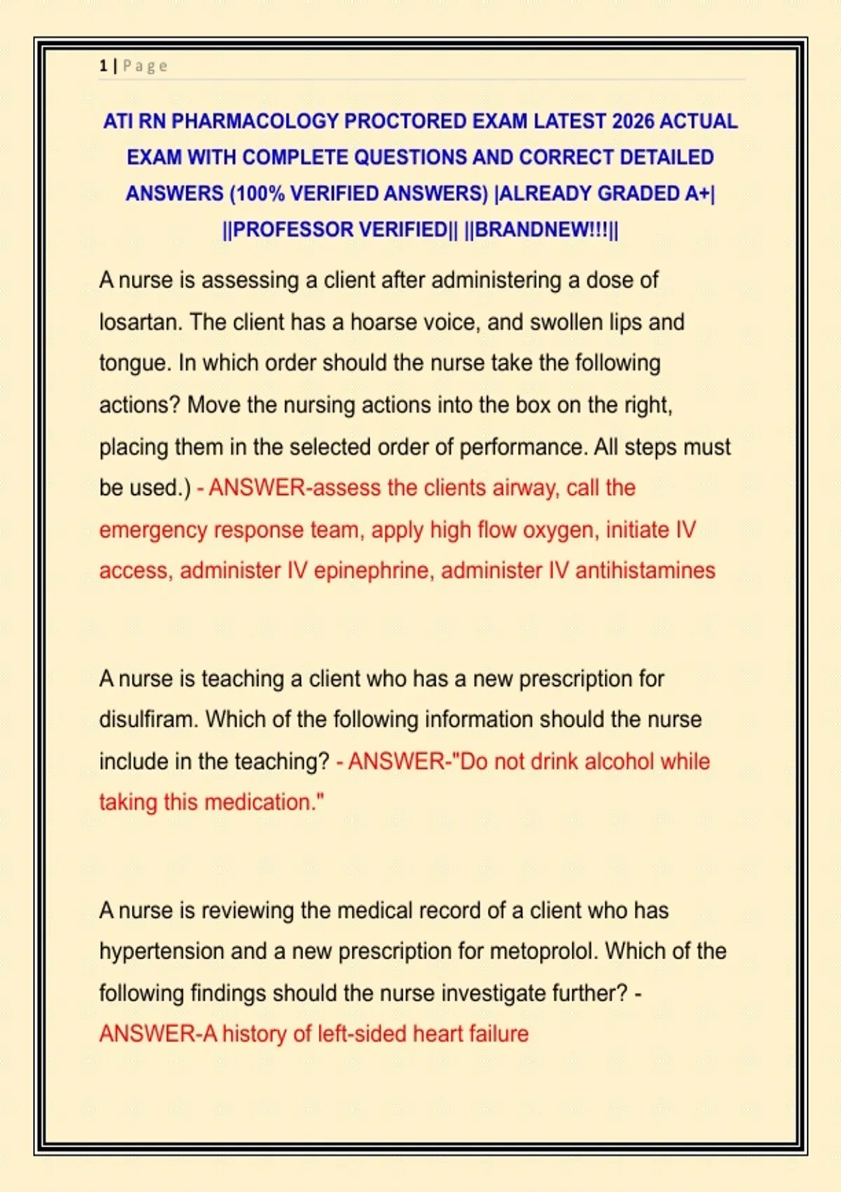 ATI RN PHARMACOLOGY PROCTORED EXAM LATEST 2026 ACTUAL EXAM WITH COMPLETE QUESTIONS AND CORRECT DETAILED ANSWERS (100% VERIFIED ANSWERS) |ALREADY GRADED A+| ||PROFESSOR VERIFIED|| ||BRANDNEW!!!||