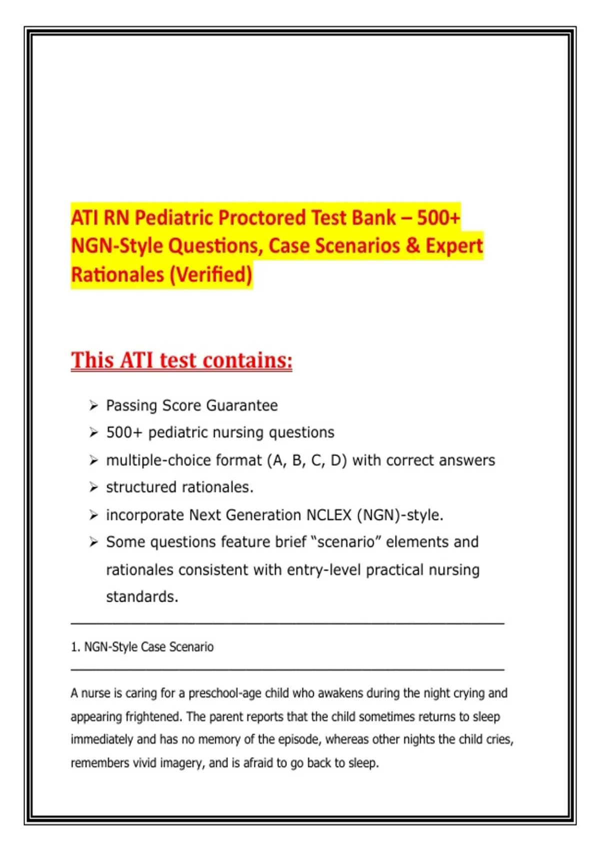 ATI RN Pediatric Proctored Test Bank – 500+ NGN‑Style Questions, Case Scenarios & Expert Rationales (VerifiedThis ATI RN Pediatric Proctored Test Bank is a comprehensive exam prep resource designed for nursing students preparing for the ATI RN Pediatric exam and the Next Generation NCLEX (NGN). It contains 500+ verified multiple‑choice questions with structured rationales and case scenarios, ensuring mastery of pediatric nursing concepts and exam success. What’s Inside: - 500+ Pediatric Nursing Questions – Multiple‑choice format (A, B, C, D) with correct answers. - NGN‑Style Case Scenarios – Realistic exam practice aligned with NCLEX standards. - Expert Rationales – Clear explanations for every answer to strengthen understanding. - Coverage of Key Pediatric Domains – Sleep disturbances (nightmares vs. night terrors), fever management, asthma care, cardiac monitoring, cystic fibrosis diagnosis, dehydration management, Hirschsprung’s disease, eczema care, medication calculations, and celiac disease dietary teaching. - Passing Score Guarantee – Verified content designed to maximize exam success. Key Benefits: - Provides realistic NGN‑style practice for NCLEX‑RN readiness. - Covers all ATI RN Pediatric domains in one complete test bank. - Includes expert rationales explaining why each answer is correct. - Designed to help RN students achieve a Level 2 or higher on ATI Pediatric exams. - Perfect for ATI prep, NCLEX review, and nursing school success