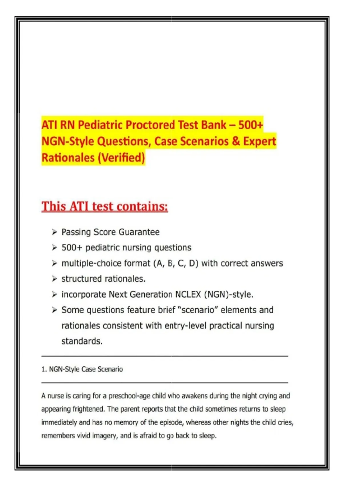 ATI RN Pediatric Proctored Test Bank – 500+ NGN‑Style Questions, Case Scenarios & Expert Rationales (VerifiedThis ATI RN Pediatric Proctored Test Bank is a comprehensive exam prep resource designed for nursing students preparing for the ATI RN Pediatric exam and the Next Generation NCLEX (NGN). It contains 500+ verified multiple‑choice questions with structured rationales and case scenarios, ensuring mastery of pediatric nursing concepts and exam success. What’s Inside: - 500+ Pediatric Nursing Questions – Multiple‑choice format (A, B, C, D) with correct answers. - NGN‑Style Case Scenarios – Realistic exam practice aligned with NCLEX standards. - Expert Rationales – Clear explanations for every answer to strengthen understanding. - Coverage of Key Pediatric Domains – Sleep disturbances (nightmares vs. night terrors), fever management, asthma care, cardiac monitoring, cystic fibrosis diagnosis, dehydration management, Hirschsprung’s disease, eczema care, medication calculations, and celiac disease dietary teaching. - Passing Score Guarantee – Verified content designed to maximize exam success. Key Benefits: - Provides realistic NGN‑style practice for NCLEX‑RN readiness. - Covers all ATI RN Pediatric domains in one complete test bank. - Includes expert rationales explaining why each answer is correct. - Designed to help RN students achieve a Level 2 or higher on ATI Pediatric exams. - Perfect for ATI prep, NCLEX review, and nursing school success