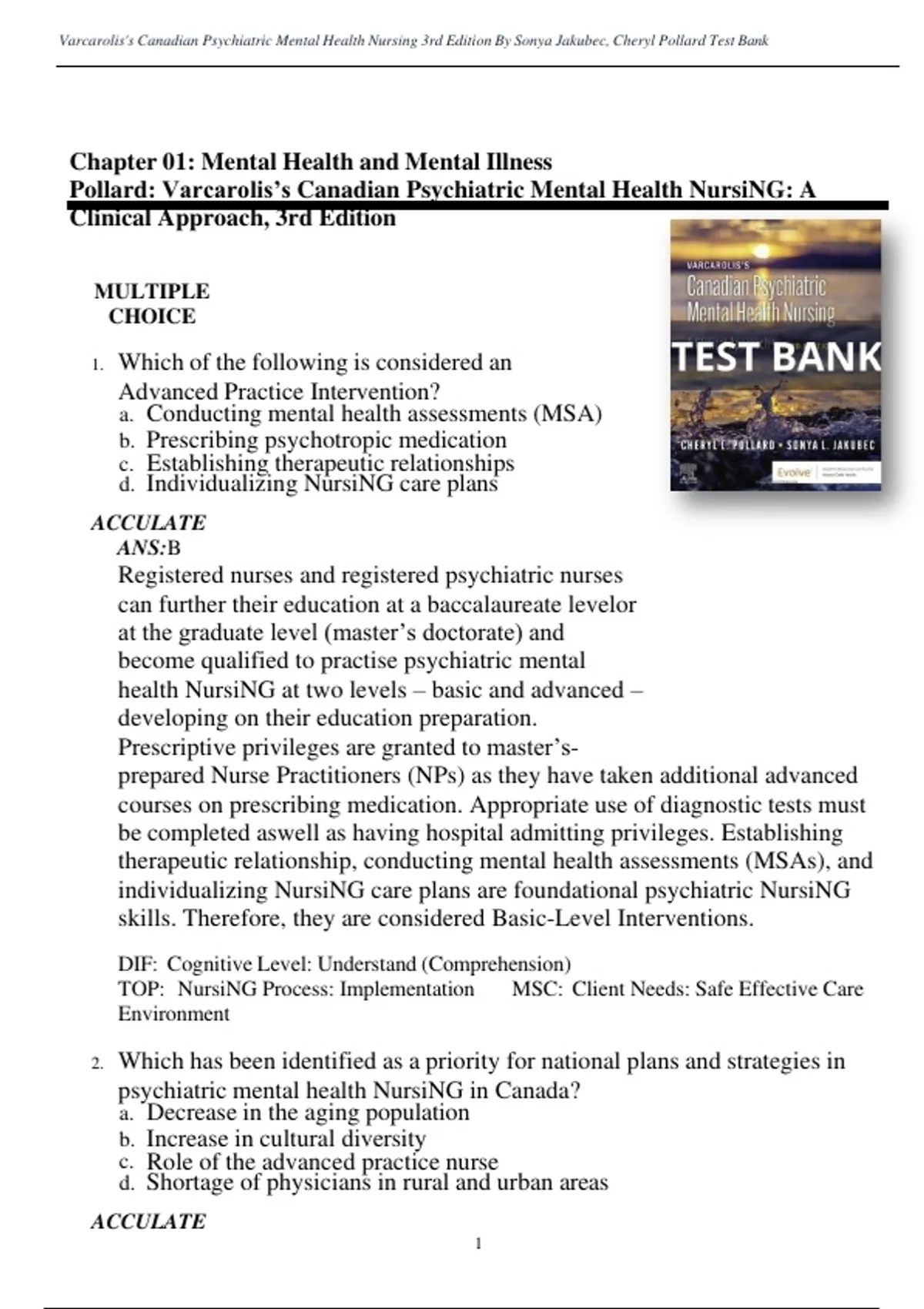 , Varcarolis's Canadian Psychiatric Mental Health Nursing 3rd Edition By Sonya Jakubec, Cheryl Pollard Test Bank