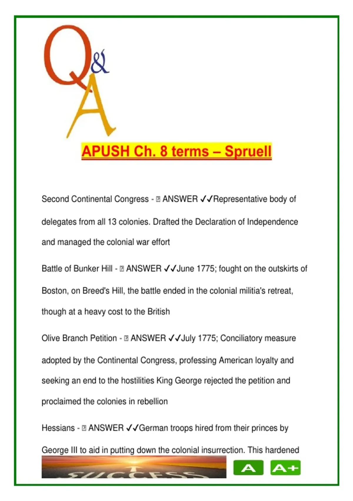This document offers a clear and well-organized review of 20 key terms and events from Chapter 8 of the AP U.S. History (APUSH) curriculum, focusing on the American Revolutionary era. It covers essential developments such as the Second Continental Congress, the Declaration of Independence, and the Olive Branch Petition, along with pivotal battles including Bunker Hill, Trenton, Saratoga, and Yorktown. The roles of key groups—Patriots, Loyalists, and Hessians—are also defined. The document highlights international involvement through terms like the Model Treaty, Armed Neutrality, and France’s support, as well as foundational diplomatic milestones such as the Treaty of Paris (1783) and Treaty of Fort Stanwix (1784). Additional concepts like Common Sense by Thomas Paine and the influence of American ideals on the French Revolution are included, offering broad context for revolutionary ideology and global impact. This vocabulary list is ideal for: AP U.S. History students preparing for unit or chapter exams Honors U.S. History courses Standard U.S. history classes covering the Revolutionary War Students needing structured summaries for class discussion, flashcards, or test review Keywords: Second Continental Congress, Battle of Bunker Hill, Olive Branch Petition, Hessians, Common Sense, Declaration of Independence, Declaration of the Rights of Man, Loyalists, Patriots, Battle of Long Island, Battle of Trenton, Battle of Saratoga, Model Treaty, Armed Neutrality, Treaty of Fort Stanwix, Privateers, Battle of Yorktown, Treaty of Paris, American Revolution, APUSH Chapter 8