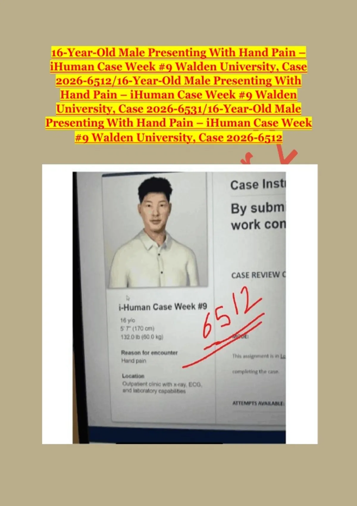 “Comprehensive i-Human Week #9 Case (Class 6512): 16-Year-Old Male with Right Hand Pain – Complete Clinical Assessment, Diagnosis, Treatment, SOAP Note, Patient Education & Follow-Up (Walden University 2026)”