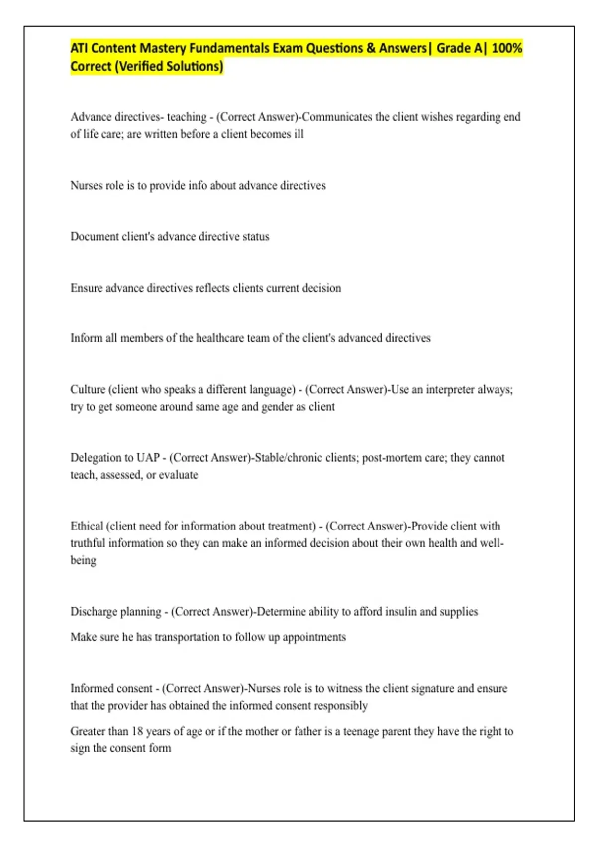 ATI Content Mastery Fundamentals Exam Questions & Answers| Grade A| 100% Correct (Verified Solutions)