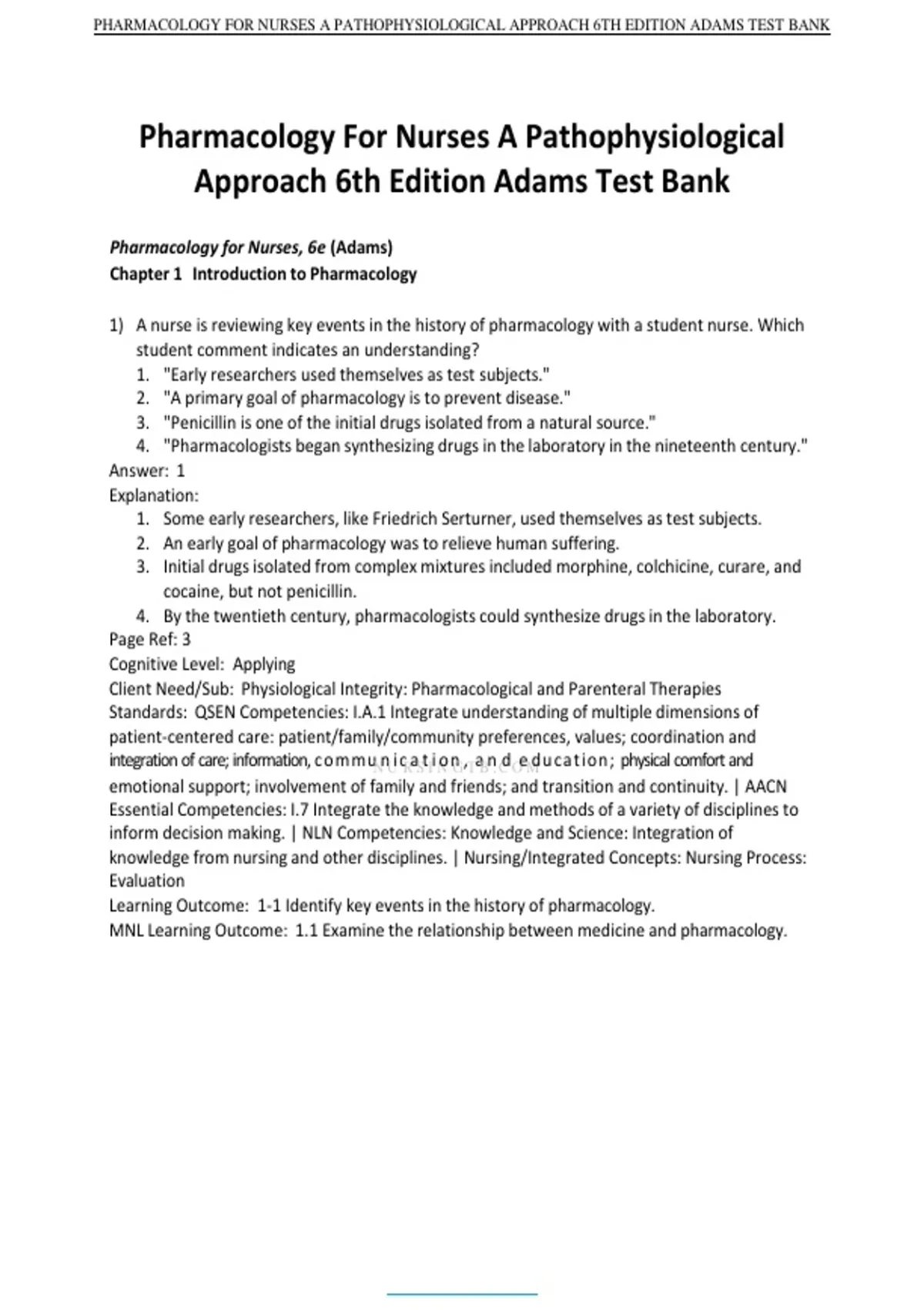Test Bank for Pharmacology for Nurses: A Pathophysiologic Approach 6th Edition A+ Test Bank For Pharmacology for Nurses 6th Edition A Pathophysiological Approach by Michael P. Adams; Norman Holland; Carol Quam Urban 9780135218334 Chapter 1-50 Complete Guide . Complete test bank for Pharmacology for Nurses: A Pathophysiologic Approach 6th Edition. Covers all chapters with accurate, verified questions and answers focused on pharmacology principles, drug classifications, and pathophysiologic applications in nursing practice.