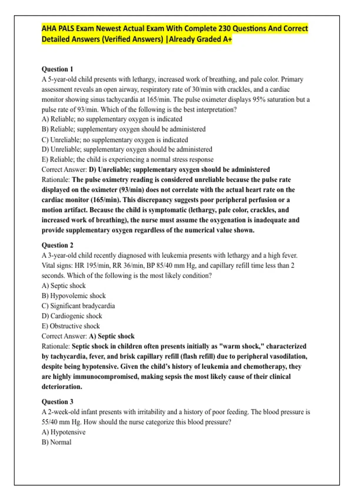AHA PALS Exam Newest Actual Exam With Complete 230 Questions And Correct Detailed Answers (Verified Answers) |Already Graded A+