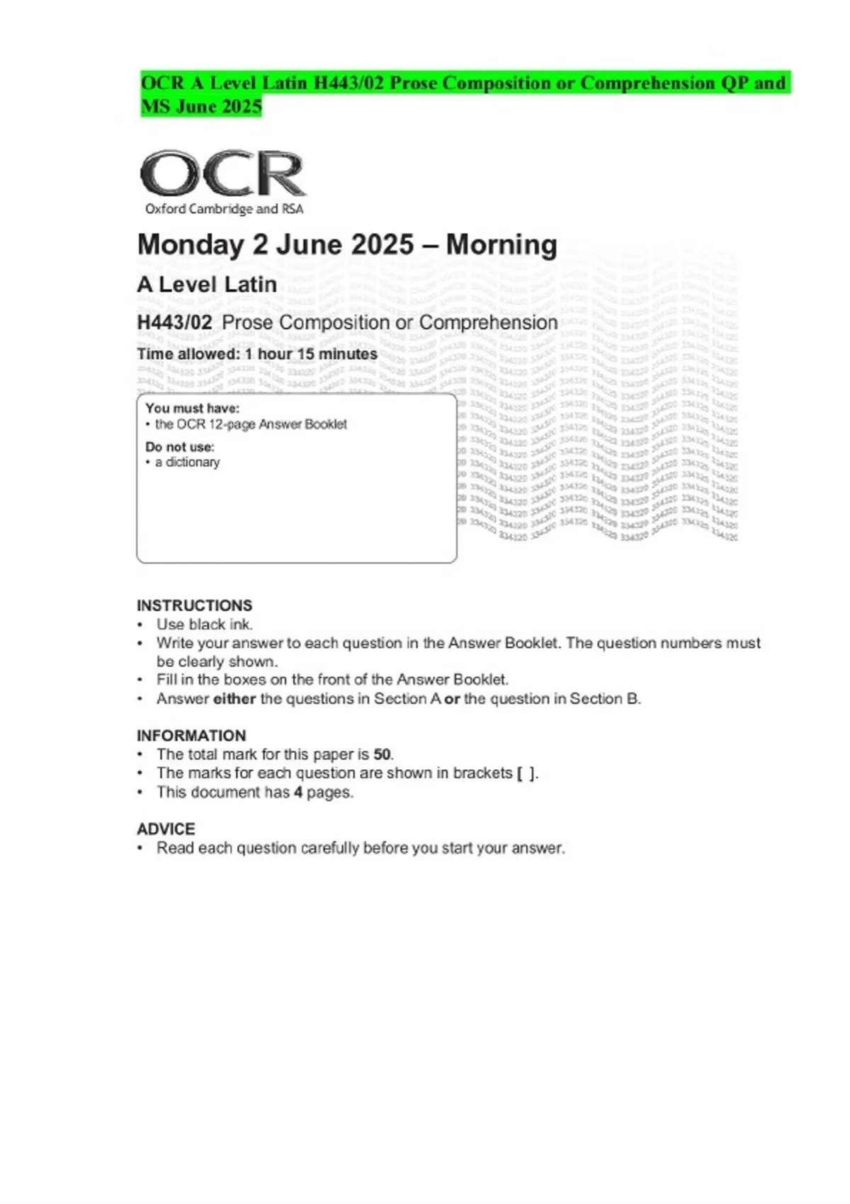 OCR A Level Latin H443/02 Prose Composition or Comprehension QP and MS June 2025