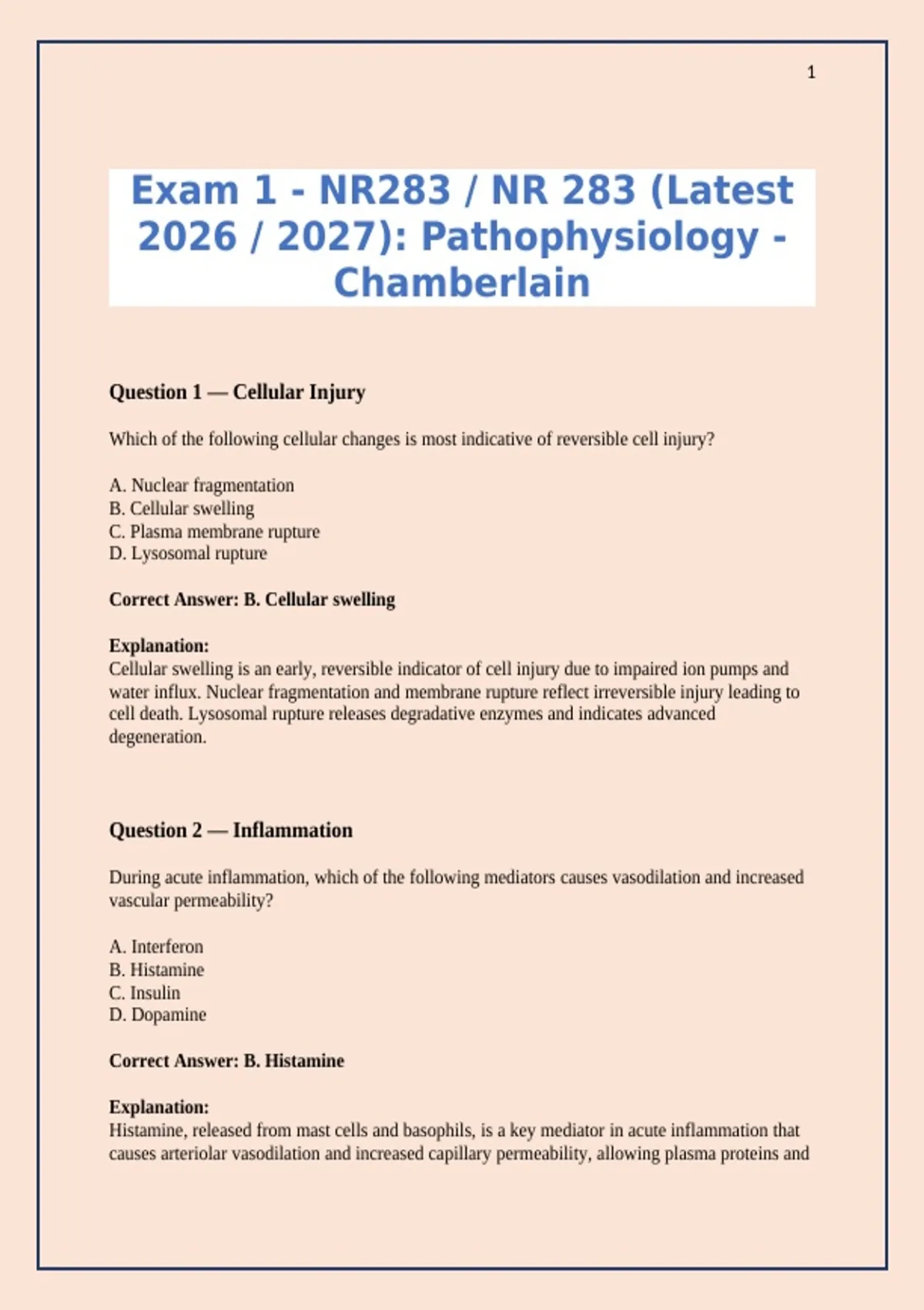 Prepare for NR283 / Pathophysiology Exam 1 with confidence! Access 180+ verified practice questions and answers with detailed explanations covering cellular injury, inflammation, immunity, genetics, tissue repair, electrolytes, and acid-base balance. Latest 2026/2027 Chamberlain updates included. Achieve Grade A and master high-yield concepts for human pathophysiology.