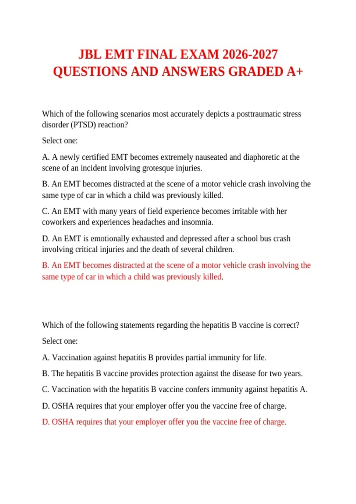 JBL EMT FINAL EXAM QUESTIONS AND ANSWERS GRADED A+