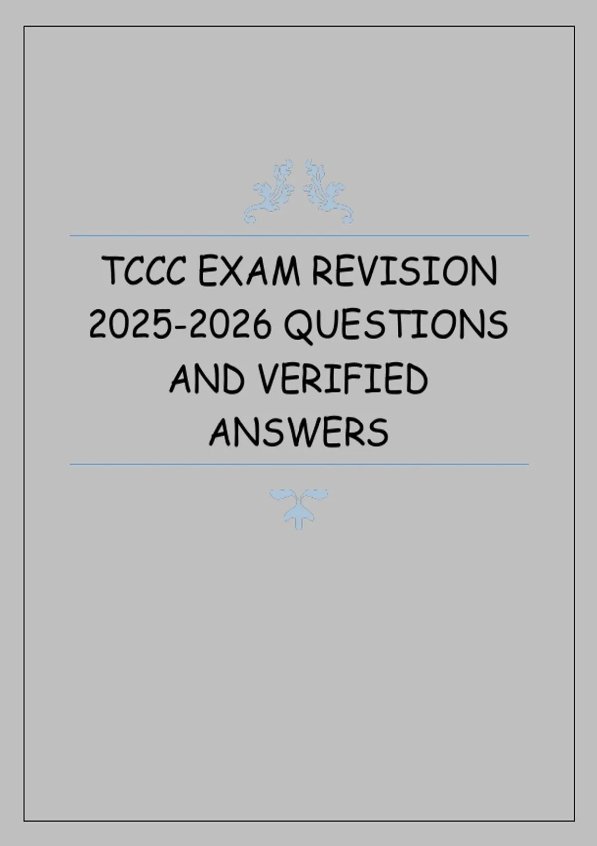 This document provides a focused revision resource for the Tactical Combat Casualty Care (TCCC) exams for the 2025–2026 academic period, including exam-style questions with verified answers. It covers essential TCCC topics such as care under fire, tactical field care, tactical evacuation care, and current guidelines to support effective exam preparation.