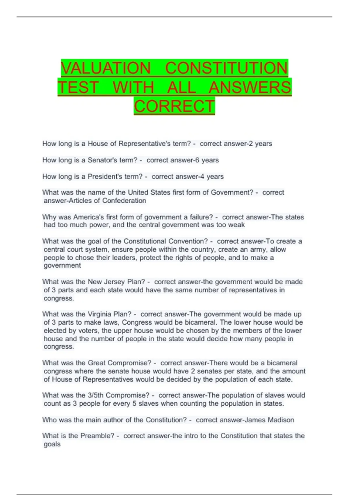 This Valuation Constitution Test is a comprehensive study resource designed to help students and professionals master key concepts in valuation and constitutional principles. The material includes carefully selected test questions with fully verified and accurate answers. Ideal for exam preparation, self-assessment, and revision, this guide ensures thorough understanding of all topics, enabling learners to confidently tackle valuation and constitution-related assessments. Perfect for anyone seeking a reliable and complete study guide.