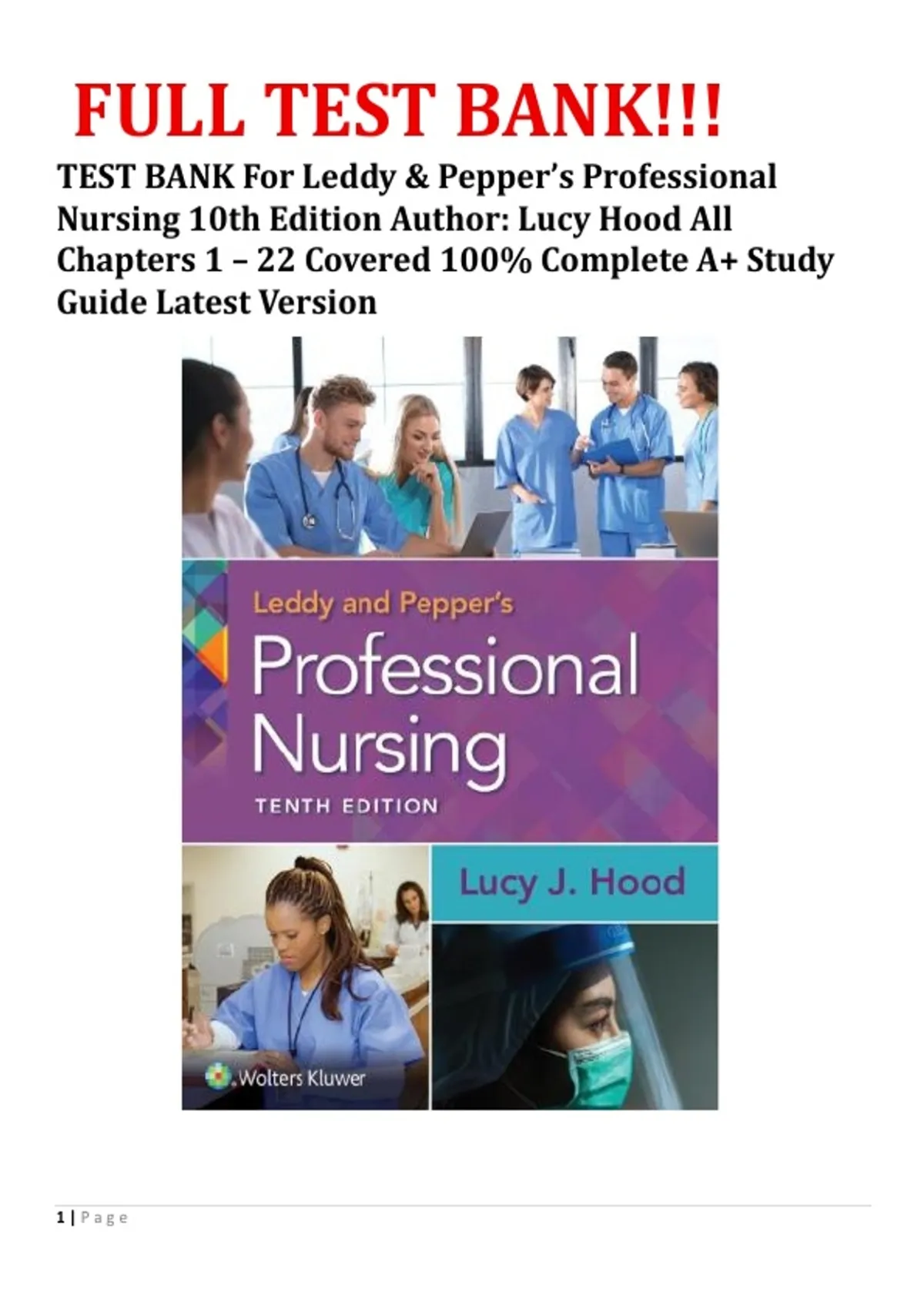TEST BANK For Leddy & Pepper’s Professional Nursing 10th Edition Author: Lucy Hood All Chapters 1 – 22 Covered 100% Complete A+ Study Guide Latest Version