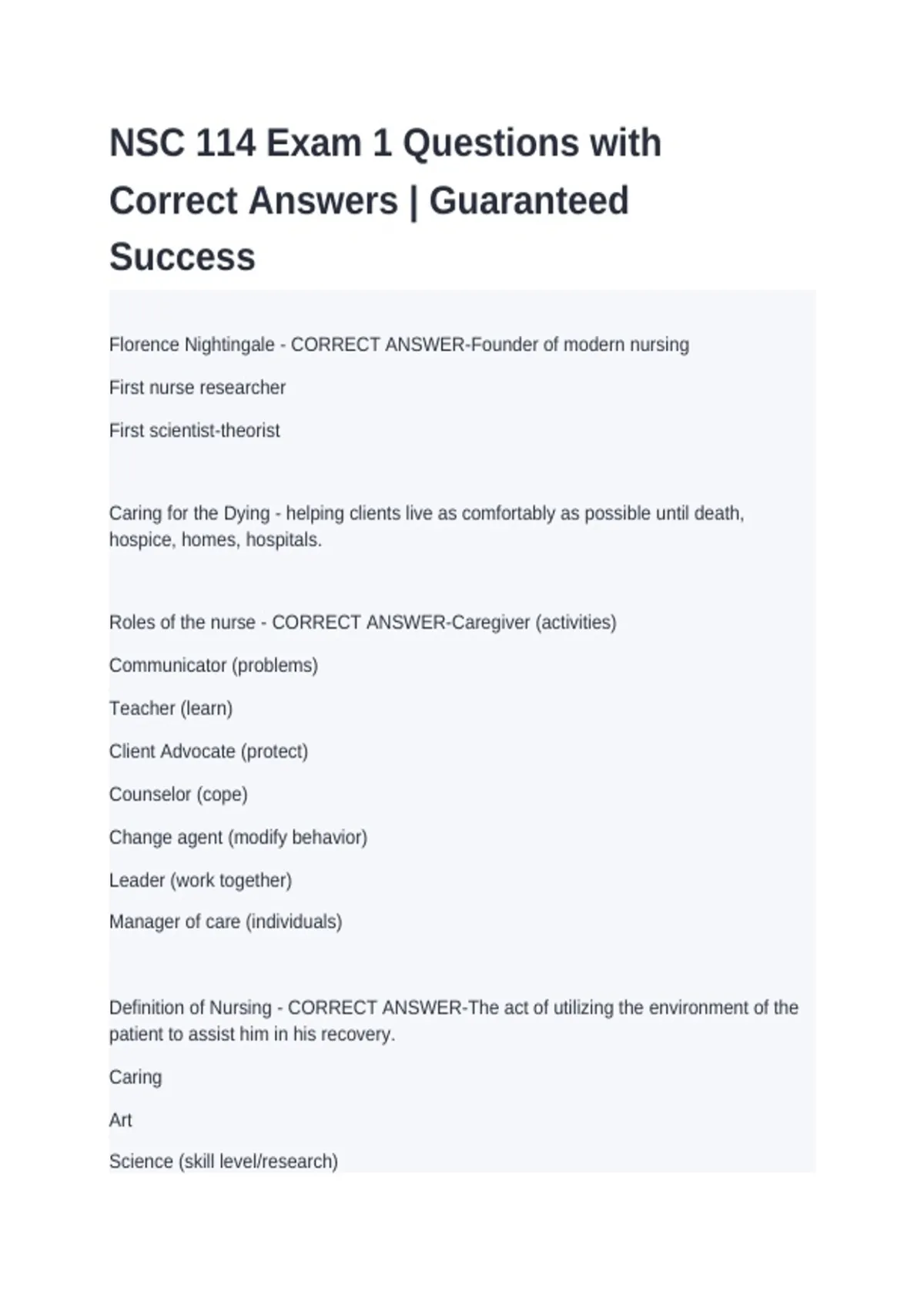 Definition of Nursing - CORRECT ANSWER-The act of utilizing the environment of the