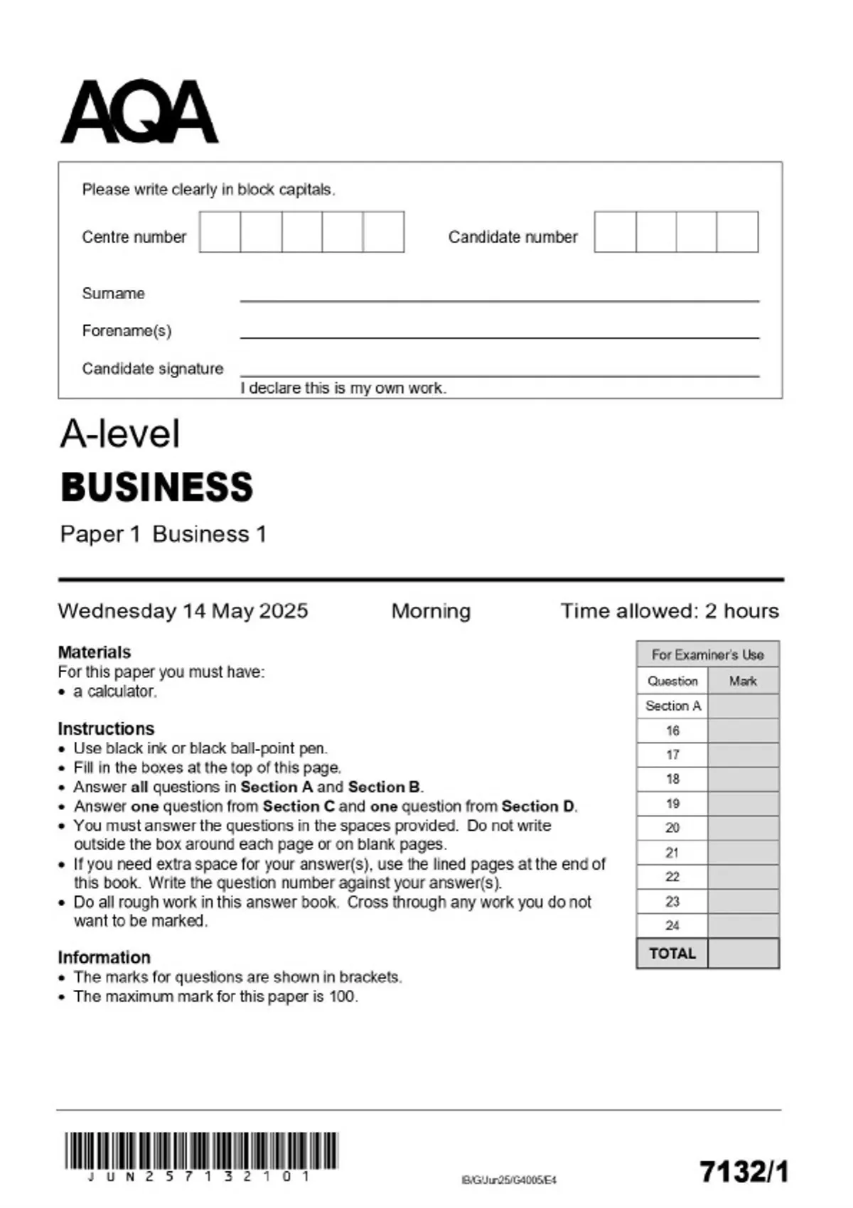 A LEVEL AQA 2025 BUSINESS PAPER 1 7132/1 MERGED QUESTION PAPER WITH MARK SCHEME