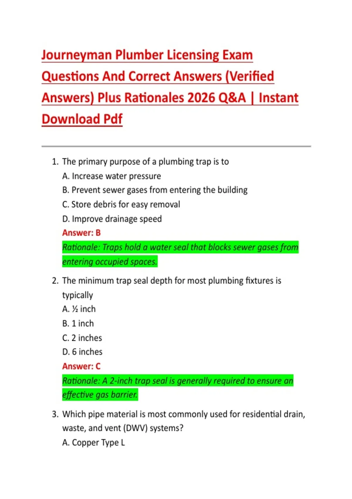 Bundle for Journeyman Plumber Licensing Exam Questions And Correct Answers (Verified Answers) Plus Rationales 2026 Q&A | Instant Download Pdf