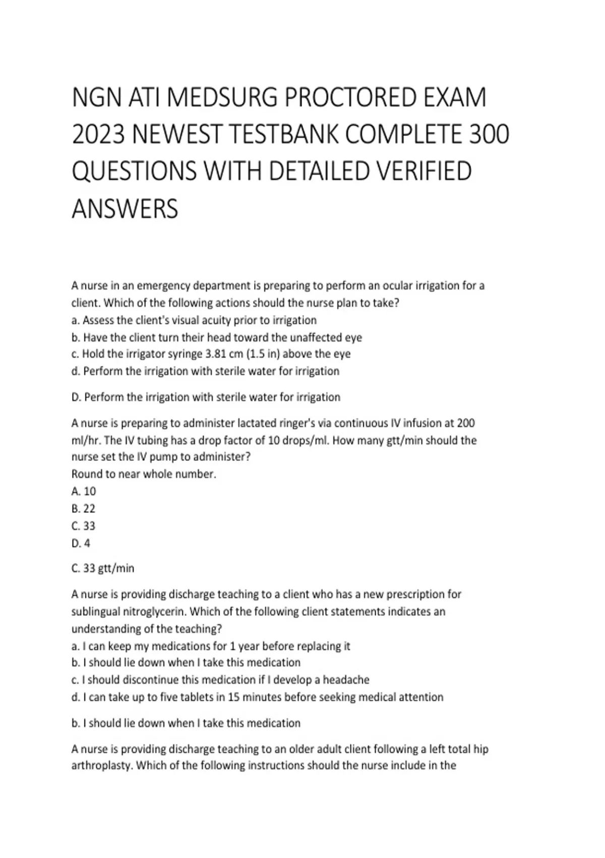 Access the NGN ATI Med-Surg Proctored Exam 2023 – Complete Test Bank, 300 Questions, fully updated for 2026/2027. This resource provides comprehensive NGN-style practice questions with verified answers and detailed rationales, covering all major medical-surgical nursing topics including patient assessment, interventions, pharmacology, pathophysiology, and critical thinking scenarios. Designed for nursing students, ATI candidates, and NCLEX prep, this guide reinforces Med-Surg concepts, enhances clinical reasoning, and ensures readiness for ATI proctored exams and NCLEX Medical-Surgical questions.