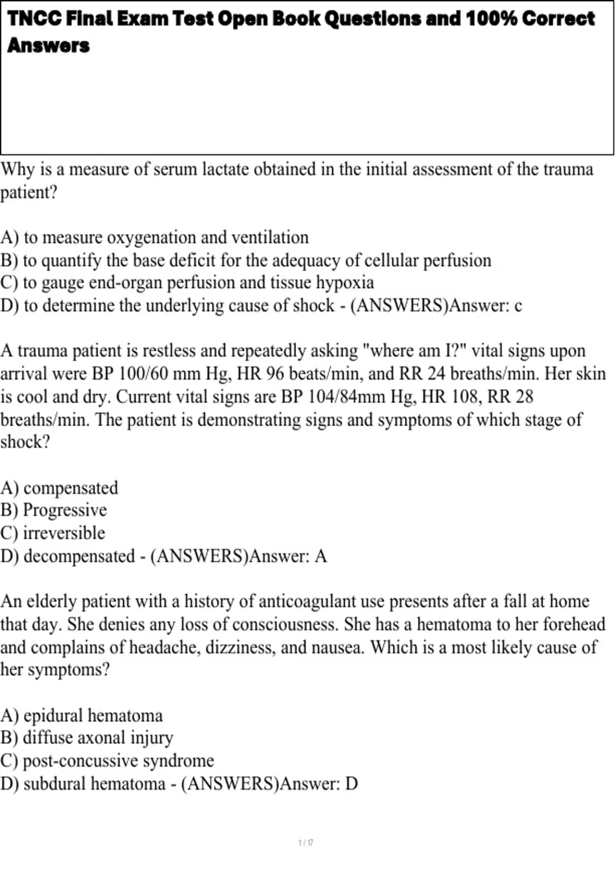 , TNCC Final Exam Test Open Book Questions and 100% Correct