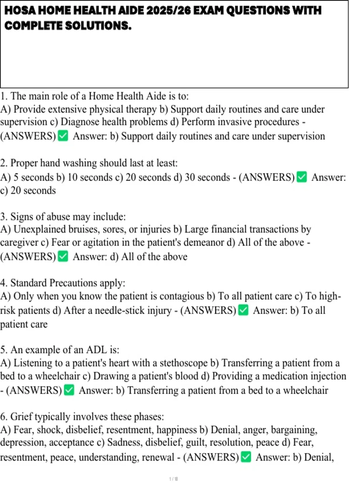 , HOSA HOME HEALTH AIDE 2025/26 EXAM QUESTIONS WITH