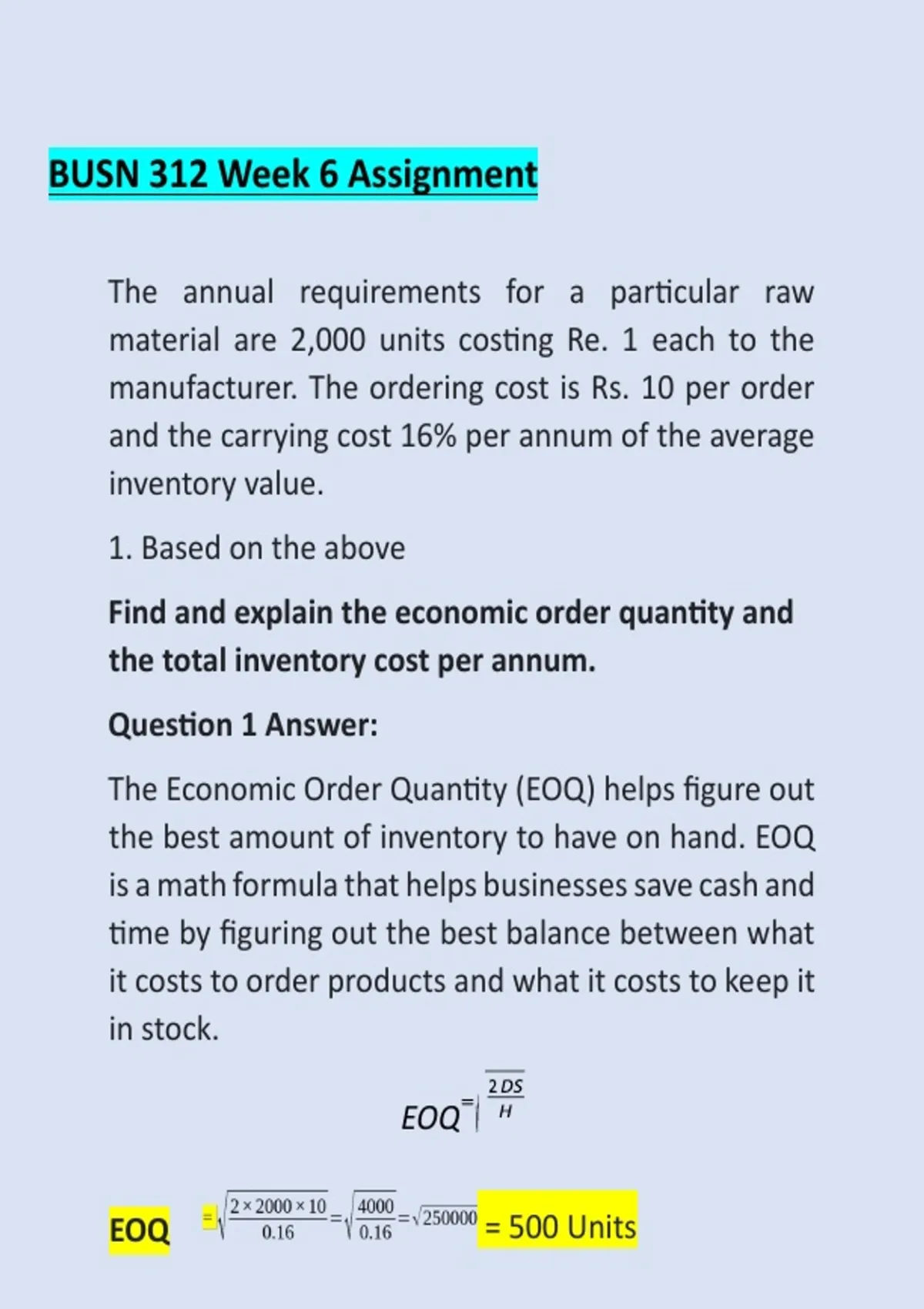 The annual requirements for a particular raw material are 2,000 units costing Re. 1 each to the manufacturer. The ordering cost is Rs. 10 per order and the carrying cost 16% per annum of the average inventory value. 1. Based on the above Find and explain the economic order quantity and the total inventory cost per annum. Question 1 Answer: The Economic Order Quantity (EOQ) helps figure out the best amount of inventory to have on hand. EOQ is a math formula that helps businesses save cash and time by figuring out the best balance between what it costs to order products and what it costs to keep it in stock. E