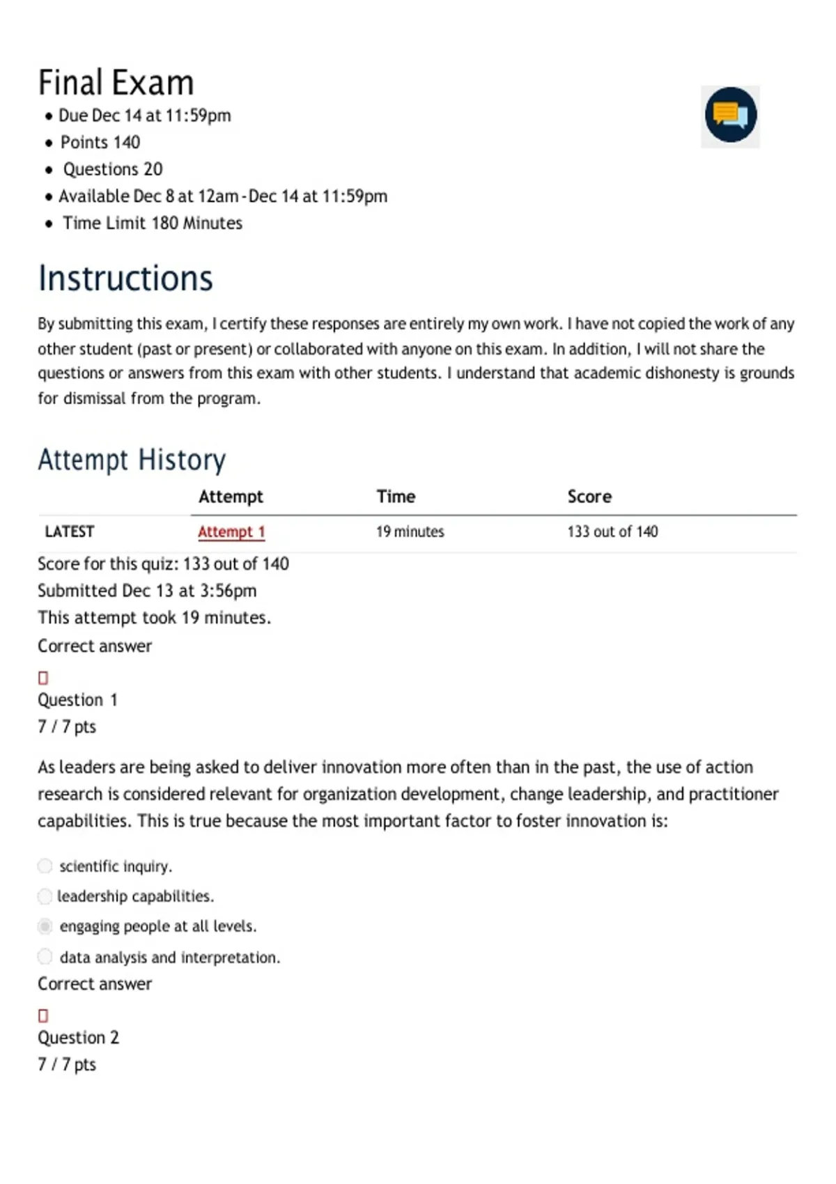 LATEST Attempt 1 19 minutes 133 out of 140