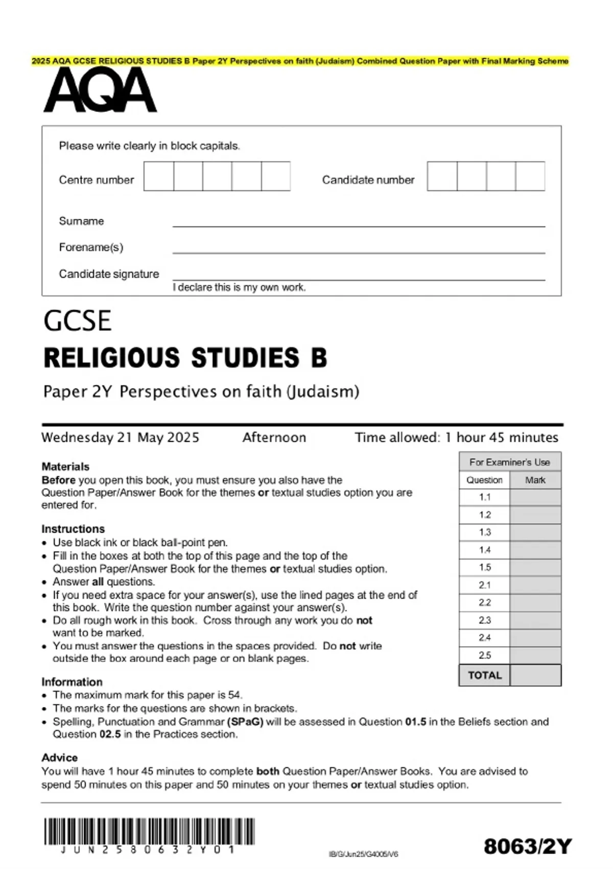 2025 AQA GCSE RELIGIOUS STUDIES B Paper 2Y Perspectives on faith (Judaism) Combined Question Paper with Final Marking Scheme