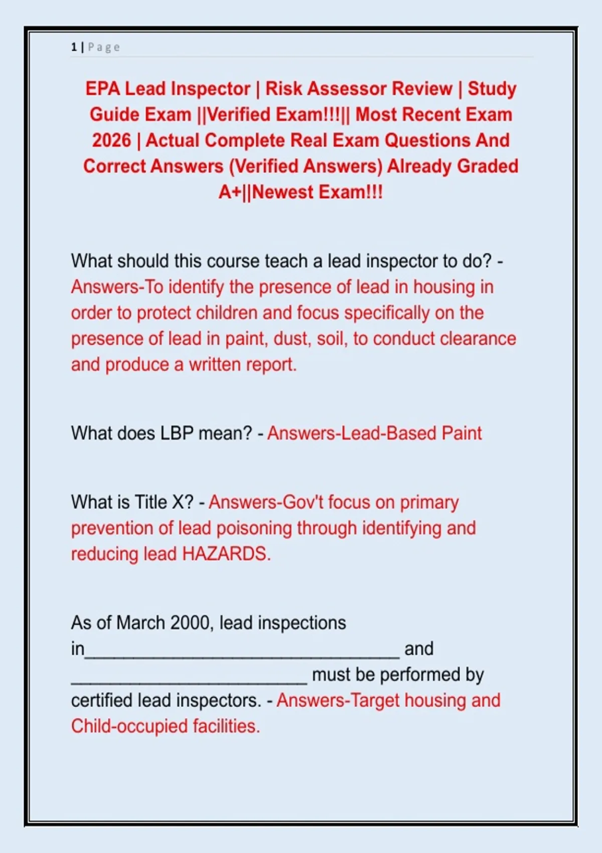 EPA Lead Inspector | Risk Assessor Review | Study Guide Exam ||Verified Exam!!!|| Most Recent Exam 2026 | Actual Complete Real Exam Questions And Correct Answers (Verified Answers) Already Graded A+||Newest Exam!!!