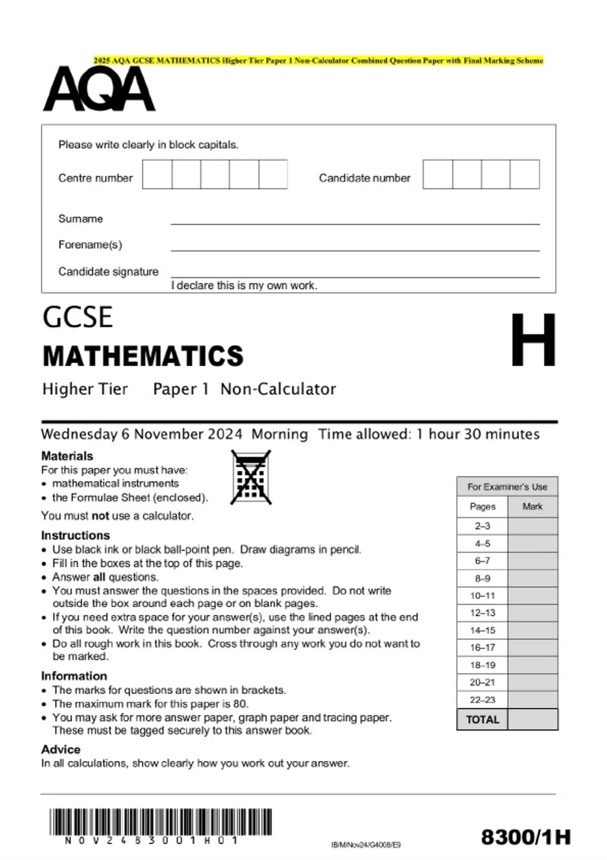 2025 AQA GCSE MATHEMATICS Higher Tier Paper 1 Non-Calculator Combined Question Paper with Final Marking Scheme