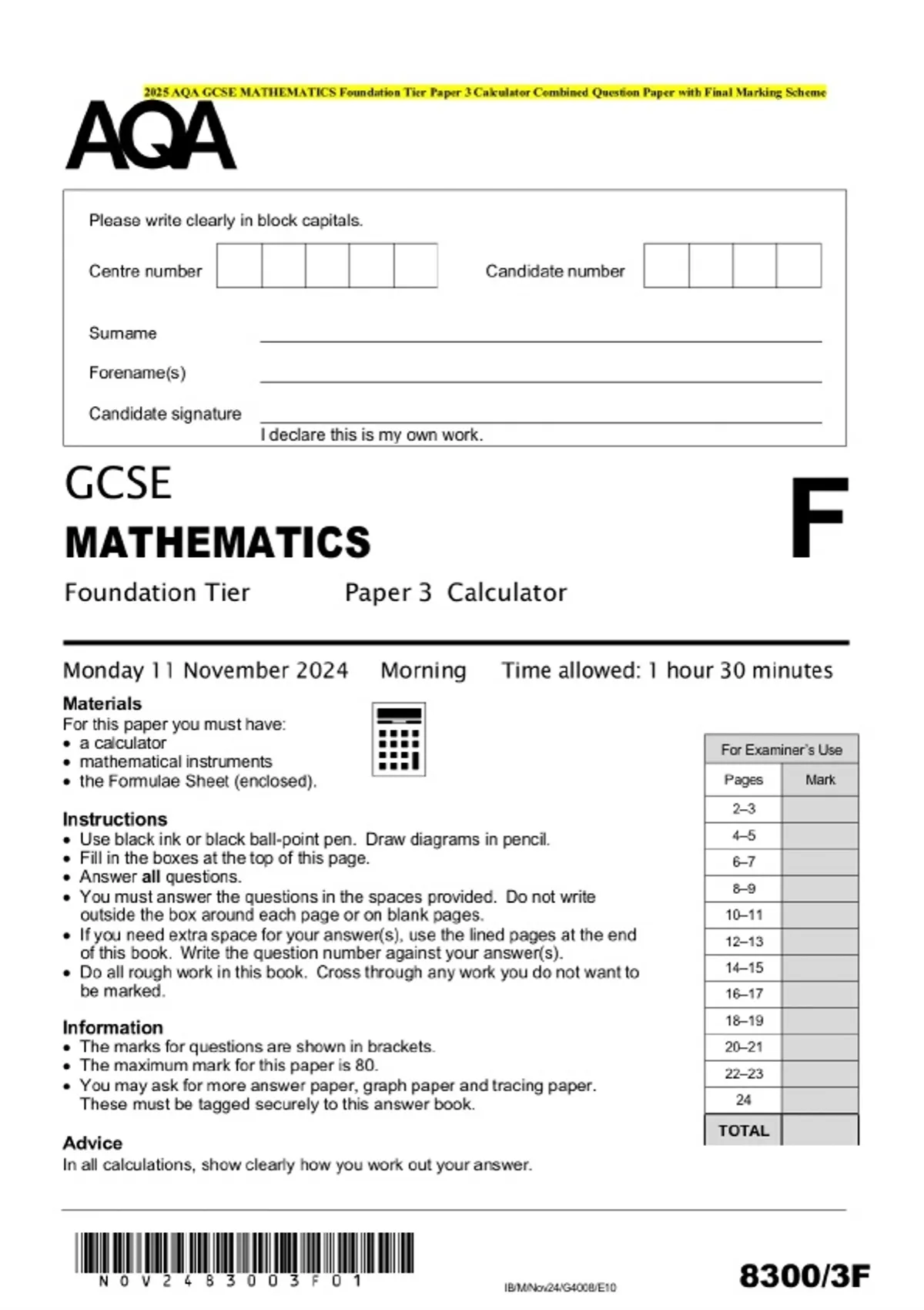 Package Deal-::2025 AQA GCSE MATHEMATICS Foundation Tier EXAMS-Question Paper with Final Marking Scheme MERGED