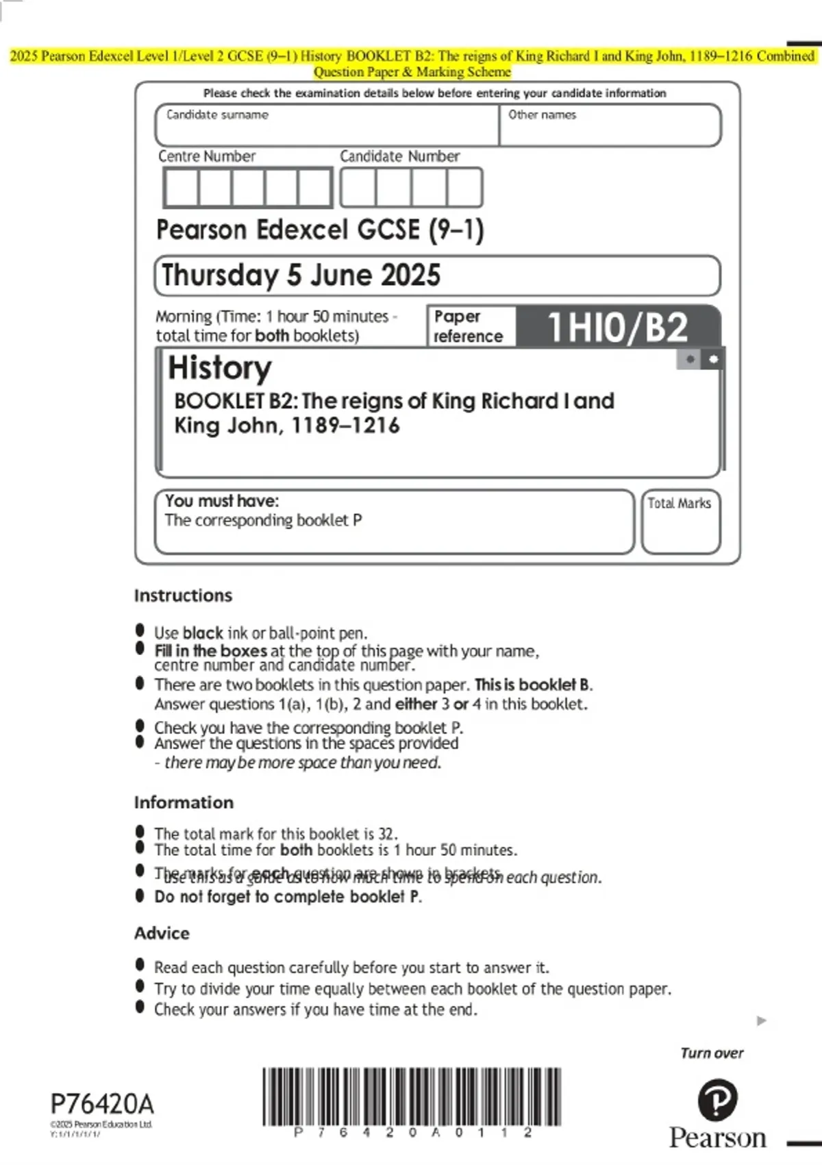 2025 Pearson Edexcel Level 1/Level 2 GCSE (9–1) History BOOKLET B2: The reigns of King Richard I and King John, 1189–1216 Exam Paper and marking scheme