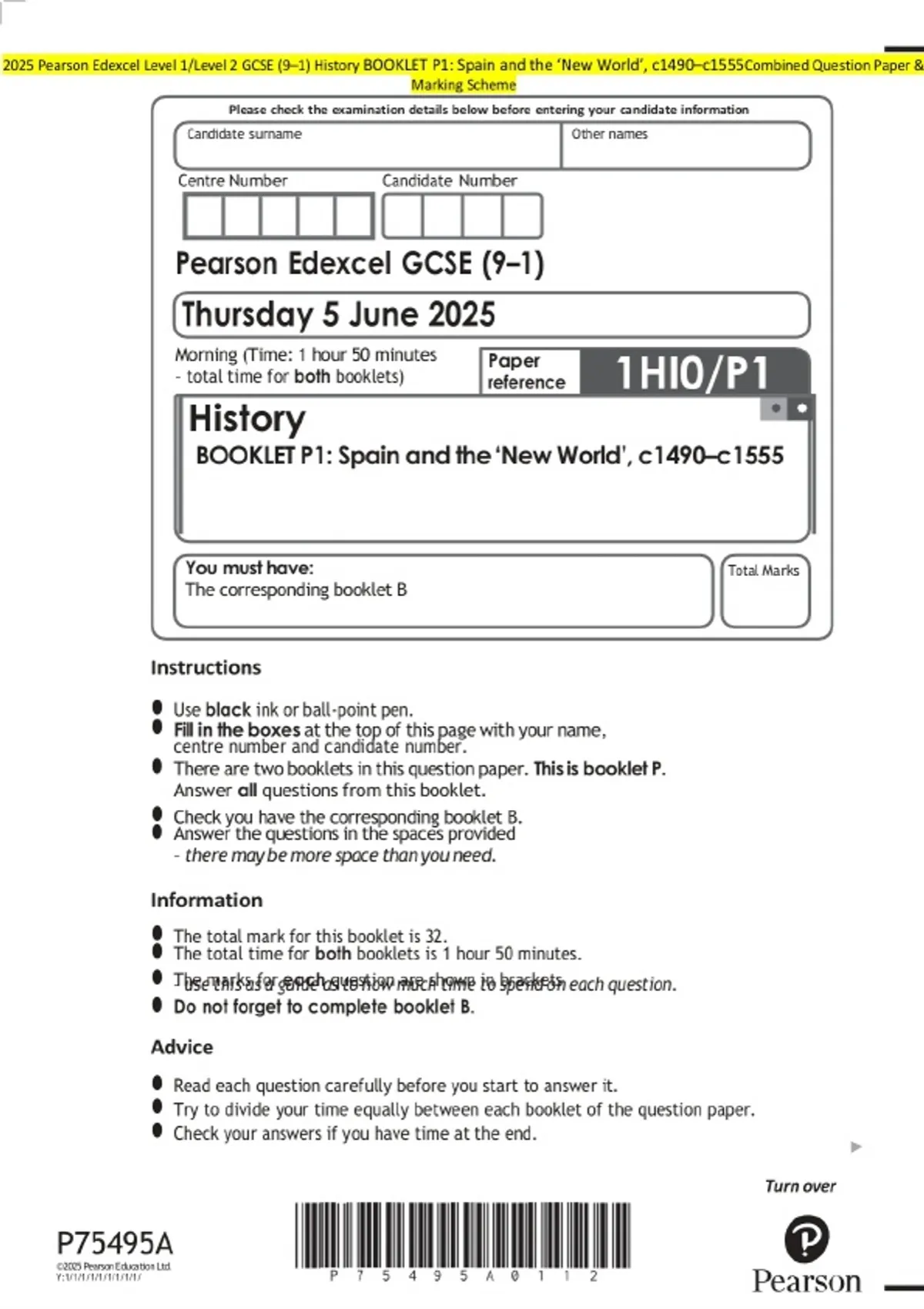 2025 Pearson Edexcel Level 1/Level 2 GCSE (9–1) History BOOKLET P1: Spain and the ‘New World’, c1490–c1555 Exam Paper and marking scheme