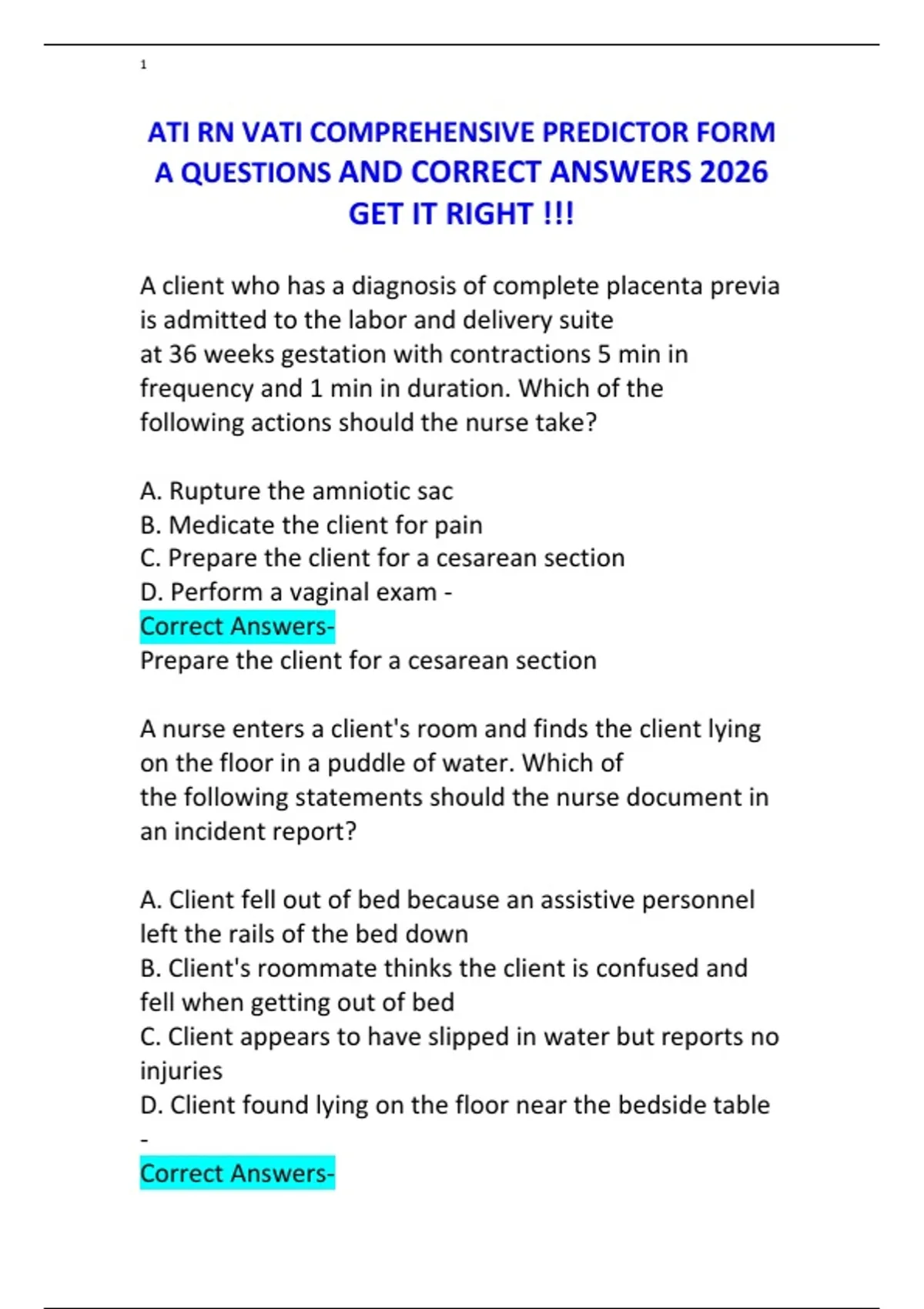 ATI RN VATI COMPREHENSIVE PREDICTOR FORM A QUESTIONS AND CORRECT ANSWERS 2026 GET IT RIGHT !!!