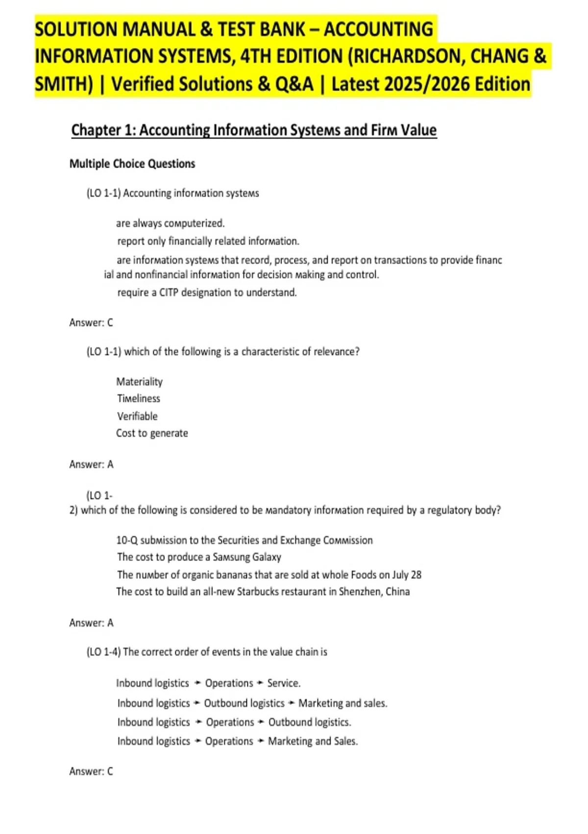 This 2025/2026 combined solution manual and test bank includes verified questions, answers, and step-by-step solutions. It is ideal for students who need both conceptual understanding and problem-solving support in AIS courses.