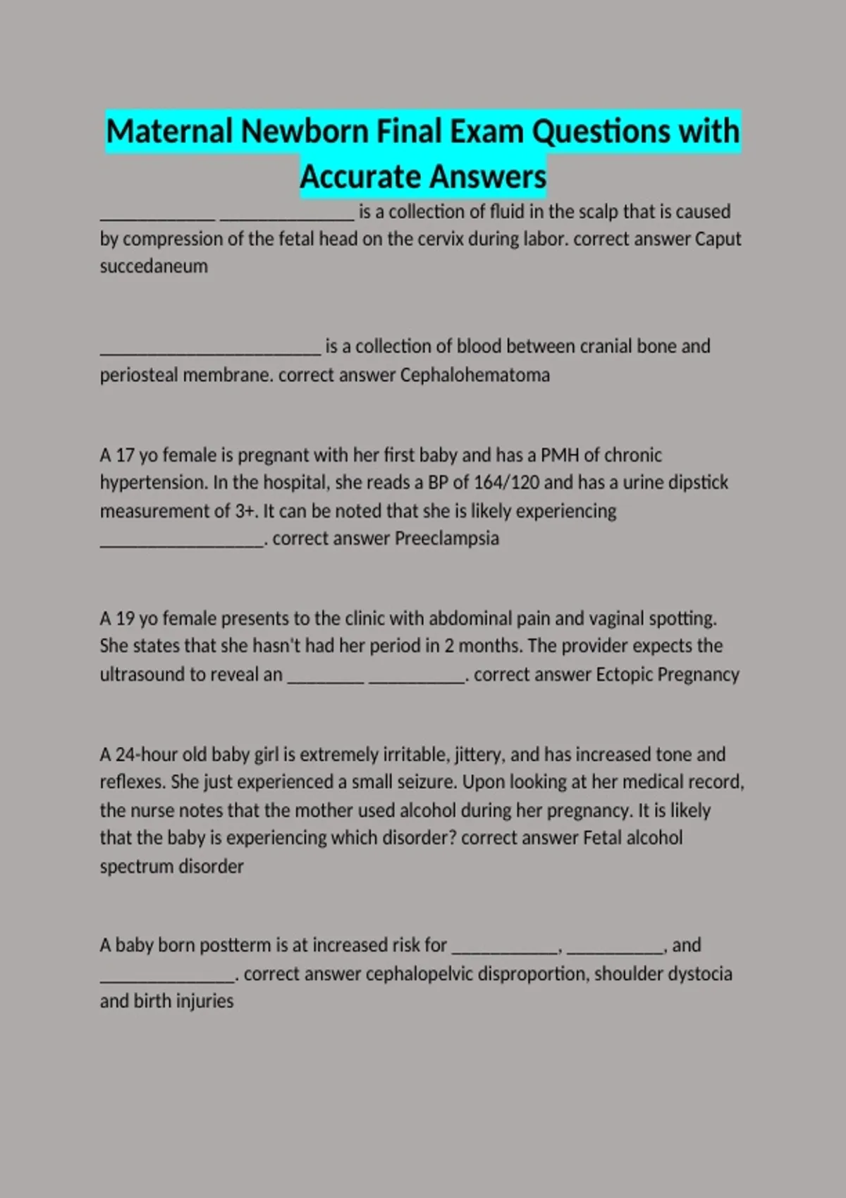 Maternal Newborn Final Exam Questions with Accurate Answers