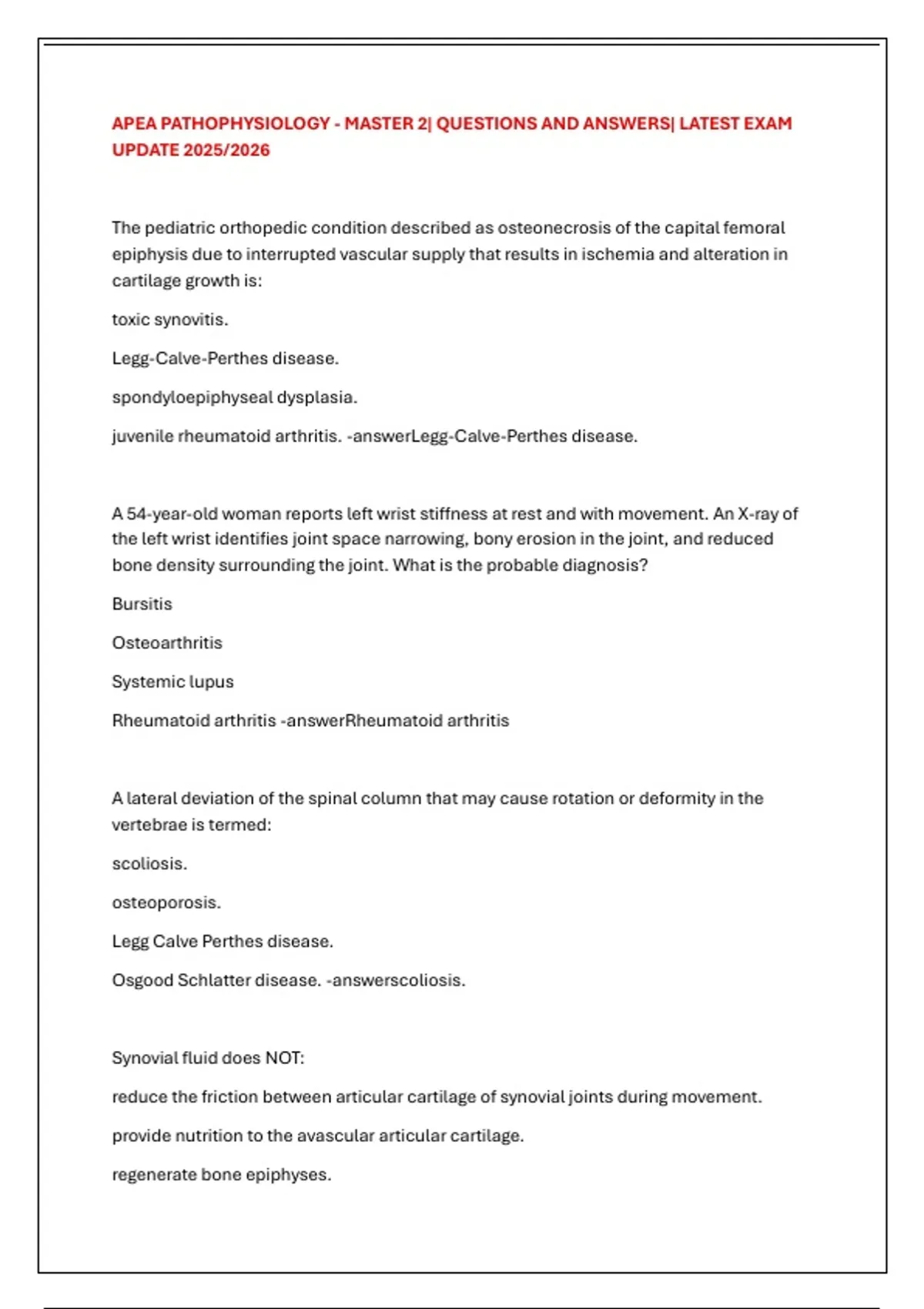 APEA PATHOPHYSIOLOGY - MASTER 2| QUESTIONS AND ANSWERS| LATEST EXAM
