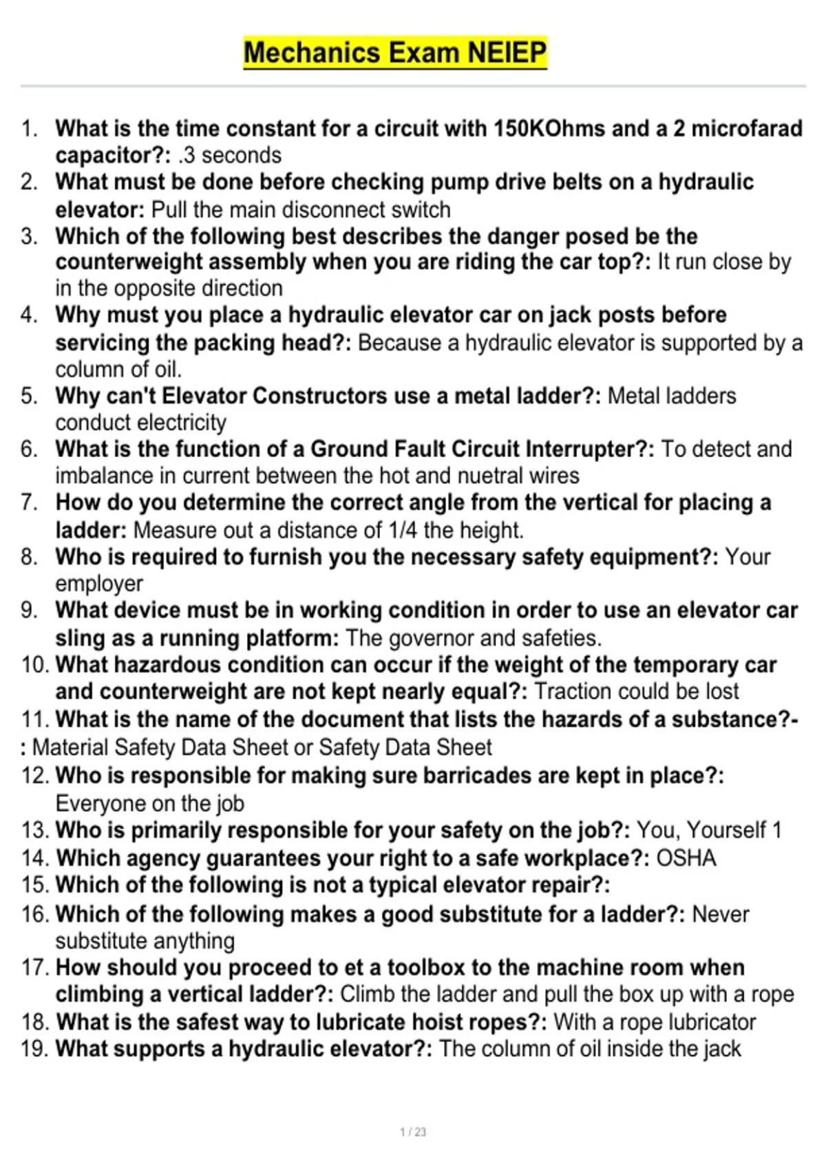 This document contains exam-style questions for the NEIEP Mechanics Exam, paired with verified correct answers to support effective certification preparation. It covers essential topics such as elevator and escalator mechanical systems, electrical fundamentals, hydraulics, safety procedures, tools and equipment, troubleshooting, and industry codes and standards.