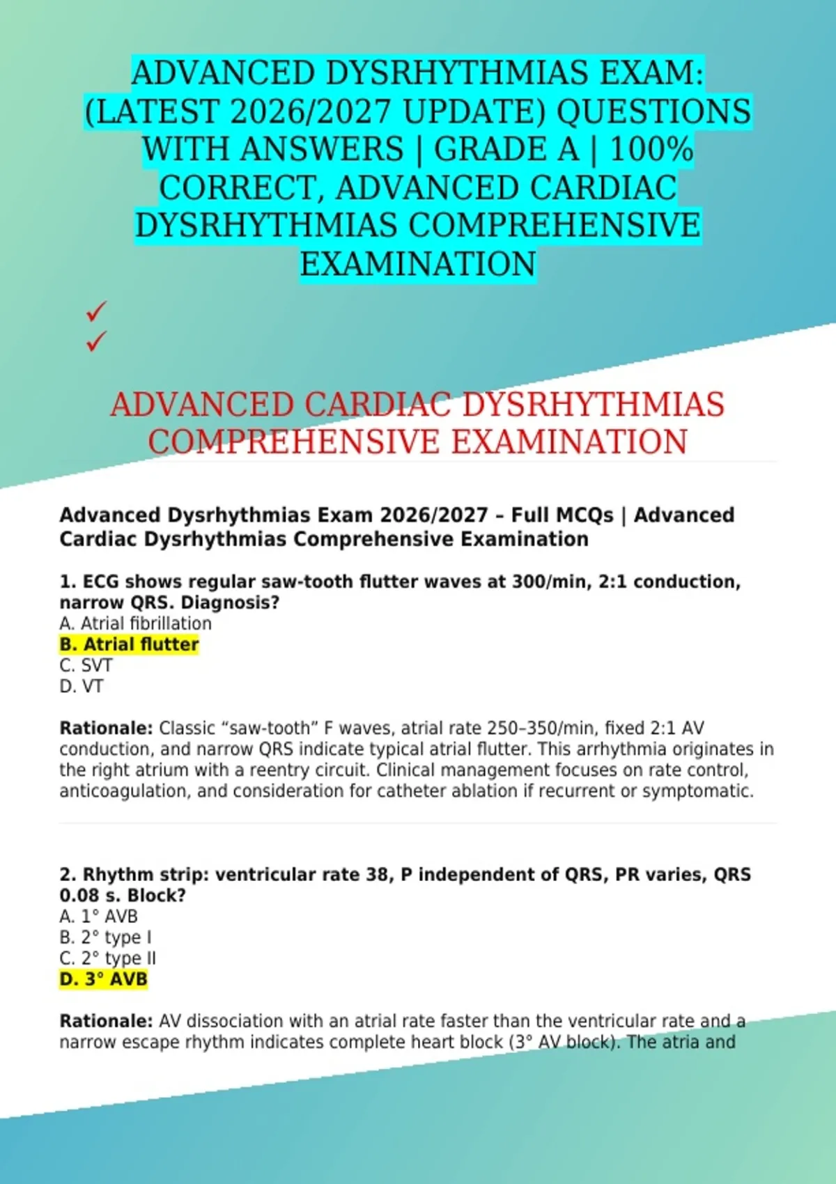 ADVANCED DYSRHYTHMIAS EXAM: (LATEST 2026/2027 UPDATE) QUESTIONS WITH ANSWERS | GRADE A | 100% CORRECT, ADVANCED CARDIAC DYSRHYTHMIAS COMPREHENSIVE EXAMINATION