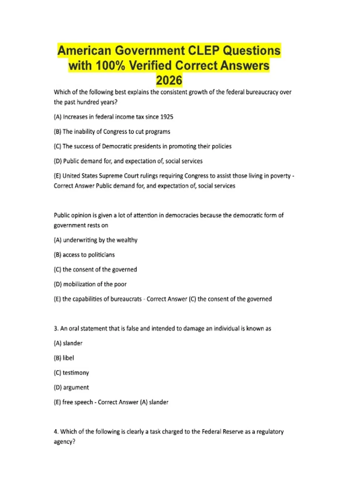 American Government CLEP Questions with 100% Verified Correct Answers 2026 Which of the following best explains the consistent growth of the federal bureaucracy over the past hundred years? (A) Increases in federal income tax since 1925 (B) The inability of Congress to cut programs (C) The success of Democratic presidents in promoting their policies (D) Public demand for, and expectation of, social services (E) United States Supreme Court rulings requiring Congress to assist those living in poverty - Correct Answer Public demand for, and expectation of, social services Public opinion is given a lot of attention in democracies because the democratic form of government rests on (A) underwriting by the wealthy (B) access to politicians (C) the consent of the governed (D) mobilization of the poor (E) the capabilities of bureaucrats - Correct Answer (C) the consent of the governed 3. An oral statement that is false and intended to damage an individual is known as (A) slander (B) libel (C) testimony (D) argument (E) free speech - Correct Answer (A) slander 4. Which of the following is clearly a task charged to the Federal Reserve as a regulatory agency?
