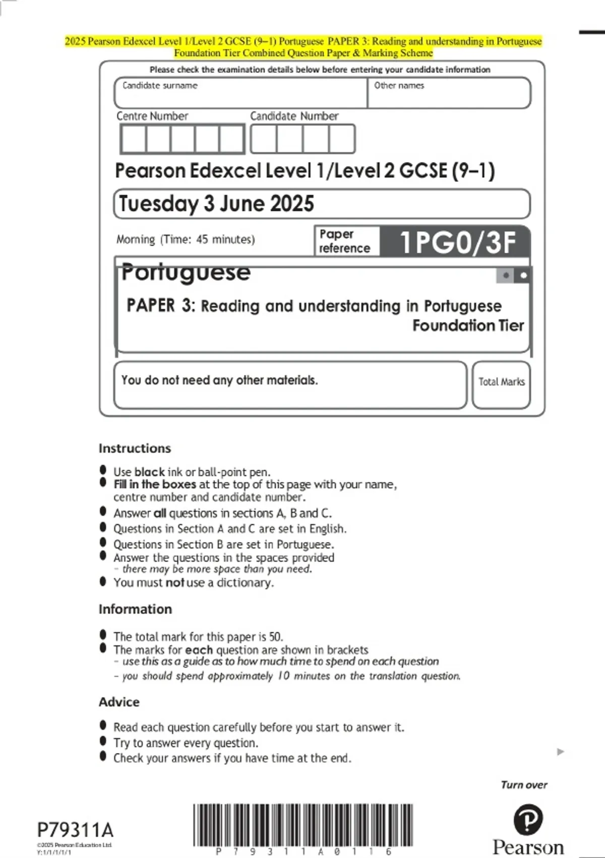 2025 Pearson Edexcel Level 1/Level 2 GCSE (9–1) Portuguese PAPER 3: Reading and understanding in Portuguese Foundation Tier Exam Paper and marking scheme