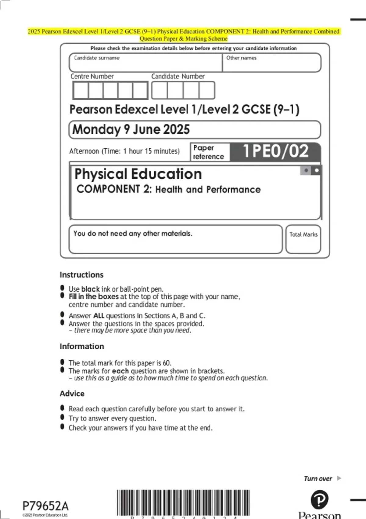 2025 Pearson Edexcel Level 1/Level 2 GCSE (9–1) Physical Education COMPONENT 2: Health and Performance Exam Paper and marking scheme