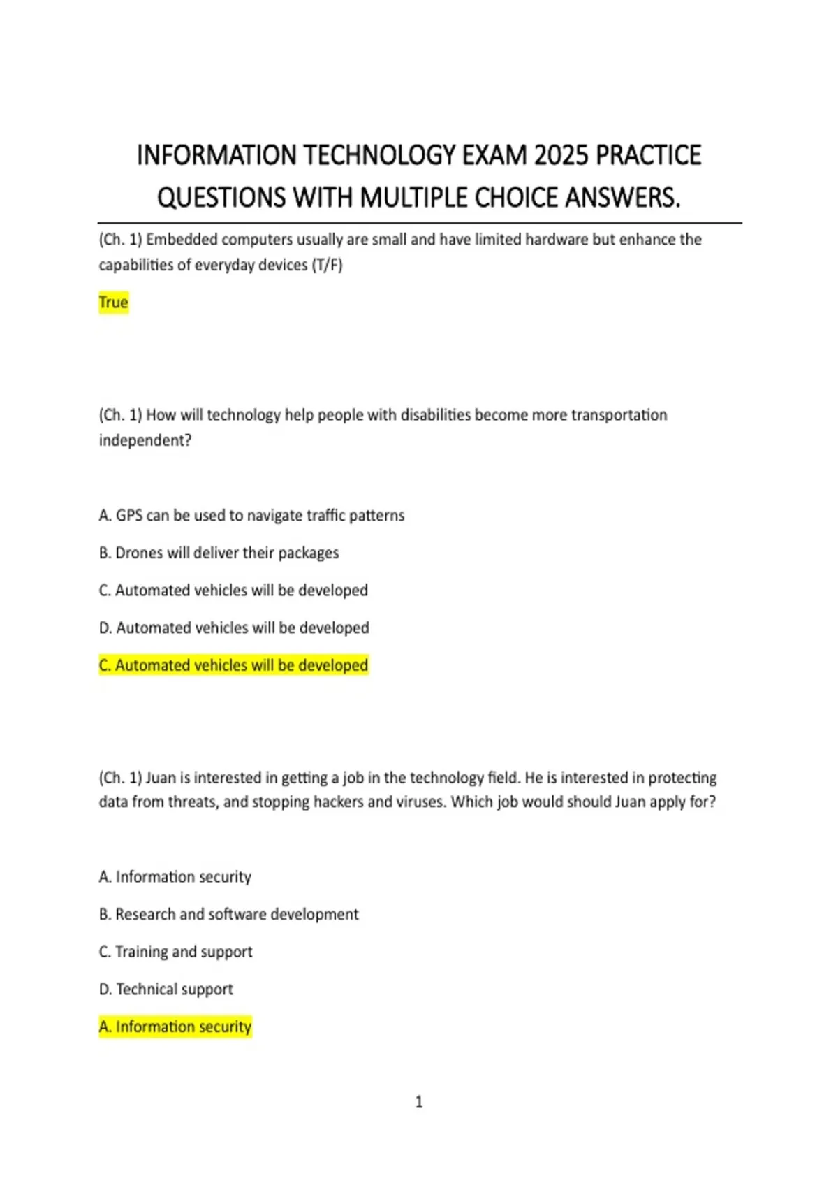 INFORMATION TECHNOLOGY EXAM 2025 PRACTICE QUESTIONS WITH MULTIPLE CHOICE ANSWERS. (Ch. 1) Embedded computers usually are small and have limited hardware but enhance the capabilities of everyday devices (T/F) True (Ch. 1) How will technology help people with disabilities become more transportation independent? A. GPS can be used to navigate traffic patterns B. Drones will deliver their packages C. Automated vehicles will be developed D. Automated vehicles will be developed C. Automated vehicles will be developed (Ch. 1) Juan is interested in getting a job in the technology field. He is interested in protecting data from threats, and stopping hackers and viruses. Which job would should Juan apply for? A. Information security B. Research and software development C. Training and support D. Technical support A. Information security (Ch. 1) How are the ways AI learns similar to how you learn? A. Both use cameras to read faces and analyze voices B. Both use past experiences to predict likely outcomes and responses C. Both use their senses to learn D. Both make decisions based on research only B. Both use past experiences to predict likely outcomes and responses (Ch. 1) How do delivery companies track packages? A. They use a learning management system B. They use code-scanning technology C. They use robotic arms to load packages D. They use GPS B. They use code-scanning technology (Ch. 1) What technology is being used when you are sent an email saying you can track your package? A. CAM B. Scan code C. M2M D. LMS B. Scan code (Ch. 1) Your company must reduce its electronic waste by 10 percent in the next year. What can the company do to meet this goals? A. Print copies of email messages B. Discard old laptops and cell phones C. Use sleep modes and other power management features for computers and devices D. Become more active on social media C. Use sleep modes and other power management features for computers and devices (Ch. 1) What types of activities are ideal for a robot to perform? A. Critical thinking B. Creative design work C. Repetitive tasks D. Group interaction C. Repetitive tasks (Ch. 1) Which technology device could be used to view a patient's internal organs? A. Mobile health record B. Electronic bracelet C. 3-D printer D. Ingestible camera D. Ingestible camera (Ch. 1) Which of the following is the science that combines technology and engineering? A. Robotics B. Augmented reality C. Digital citizenship D. Natural language processing A. Robotics (Ch. 1) The fifth grade class at the local elementary school is doing a class project on recycling and wants to involve the entire community. How could they inform community members about their project using social networking? A. They could create a hashtag and post on social media B. They could call all their neighbors C. They could put flyers in everyone's mailbox D. They could contact the newspaper to run an article A. They could create a hashtag and post on social media. (Ch. 1) At the beginning of the school year, each classroom was given one box of copy paper to make all their copies for the year. How do you think the teachers will be able to make that one box last all year long? A. Email all the documents home, so the students can print them out there. B. Have students share copies and rotate who turns it in so each time one student gets a grade. C. Place as many documents as possible online, reducing the need for paper printouts. D. Ask each parent to donate a box of paper so more copies can be made. C. Place as many documents as possible online, reducing the need for paper printouts. (Ch. 1) Tameka is expecting a baby and her partner wants to make sure he can get her to the hospital on the day of delivery using the fastest route possible regardless of time of day. How should he decide which technology to use? A. He should choose a navigation app with artificial intelligence that can provide information about preferred routes. B. He should choose a digital assistant that guesses where he wants to go based on the date. C. He should choose an app with augmented reality that displays points of interest as he drives. D. He should choose a product that uses natural language processing, so he can type in where he wants to go. A. He should choose a navigation app with artificial intelligence that can provide information about preferred routes. (Ch. 1) Taran wants to work in the technology field but is unsure of which career to pursue. He has been told he has strong people skills; he is good at figuring out what is wrong with computers and fixing them; and he is patient and helpful when others do not know how to use computers. As his college advisor, which technology careers would you suggest he explore? A. System development B. System security C. Help desk support D. Data scientist C. Help desk support (Ch. 1) How would you describe an intelligent workplace? A. It holds meetings only via web conferencing and markets itself over social media. B. It has a bring your own device (BYOD) policy allowing online collaboration. C. Its workers all telecommute and use the cloud. D. It uses technology to enable workers to connect and communicate. D. It uses technology to enable workers to connect and communicate. (Ch. 1) How do advertisers use data to know which products would most likely appeal to you? A. They monitor the television stations you watch. B. They track your movements on your Fitbit. C. They analyze your text messages sent to your friends. D. They track your Facebook and Instagram posts and "likes." D. They track your Facebook and Instagram posts and "likes." (Ch. 1) The teachers in the Mathematics Department want to increase student retention and success rates in all the math courses. They are interested in looking for something that will allow students to check their progress, take practice tests, and message instructors with questions. What would you recommend they consider? A. A learning management system B. A social networking platform