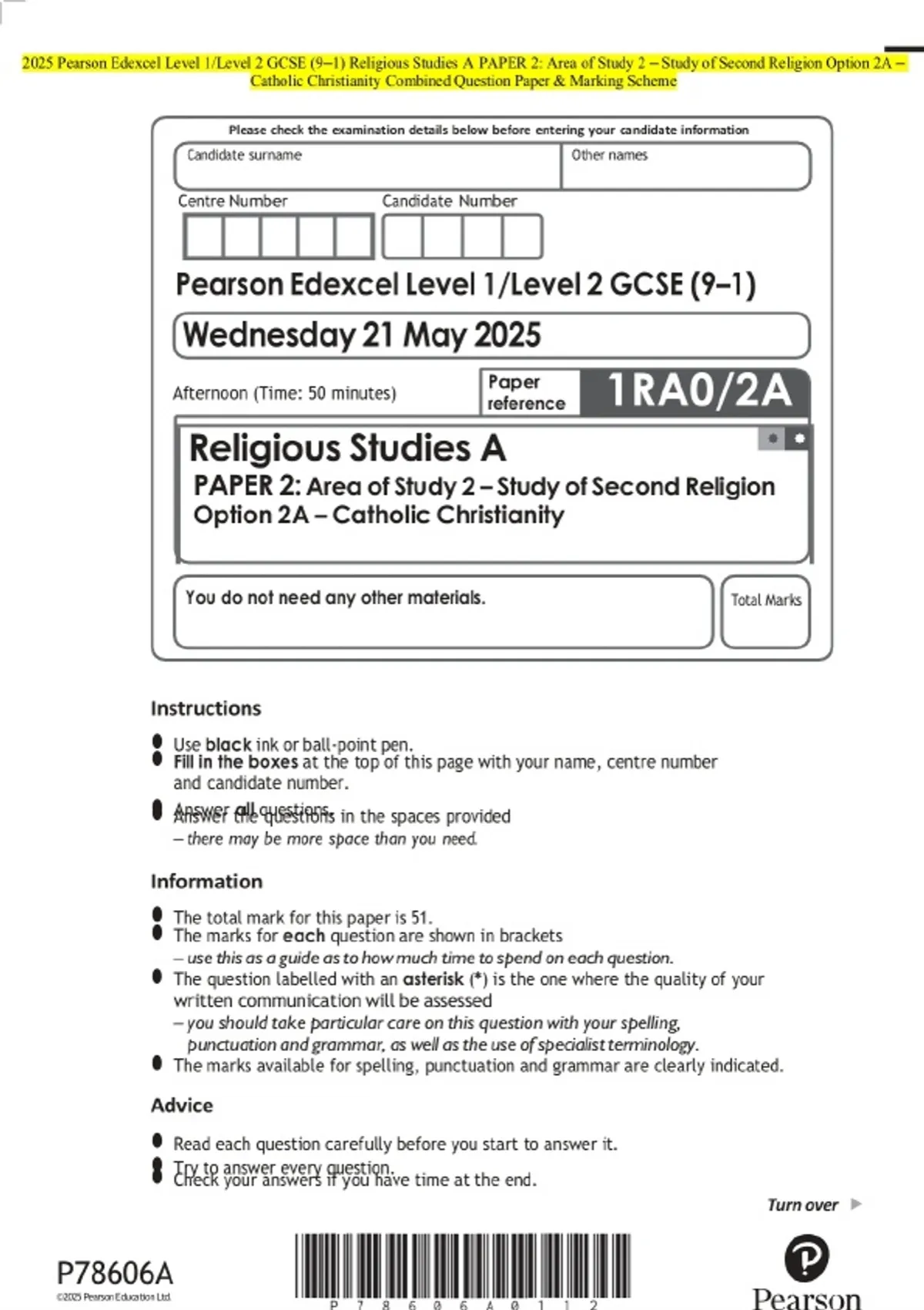 2025 Pearson Edexcel Level 1/Level 2 GCSE (9–1) Religious Studies A PAPER 2: Area of Study 2 – Study of Second Religion Option 2A – Catholic Christianity Exam Paper and marking scheme
