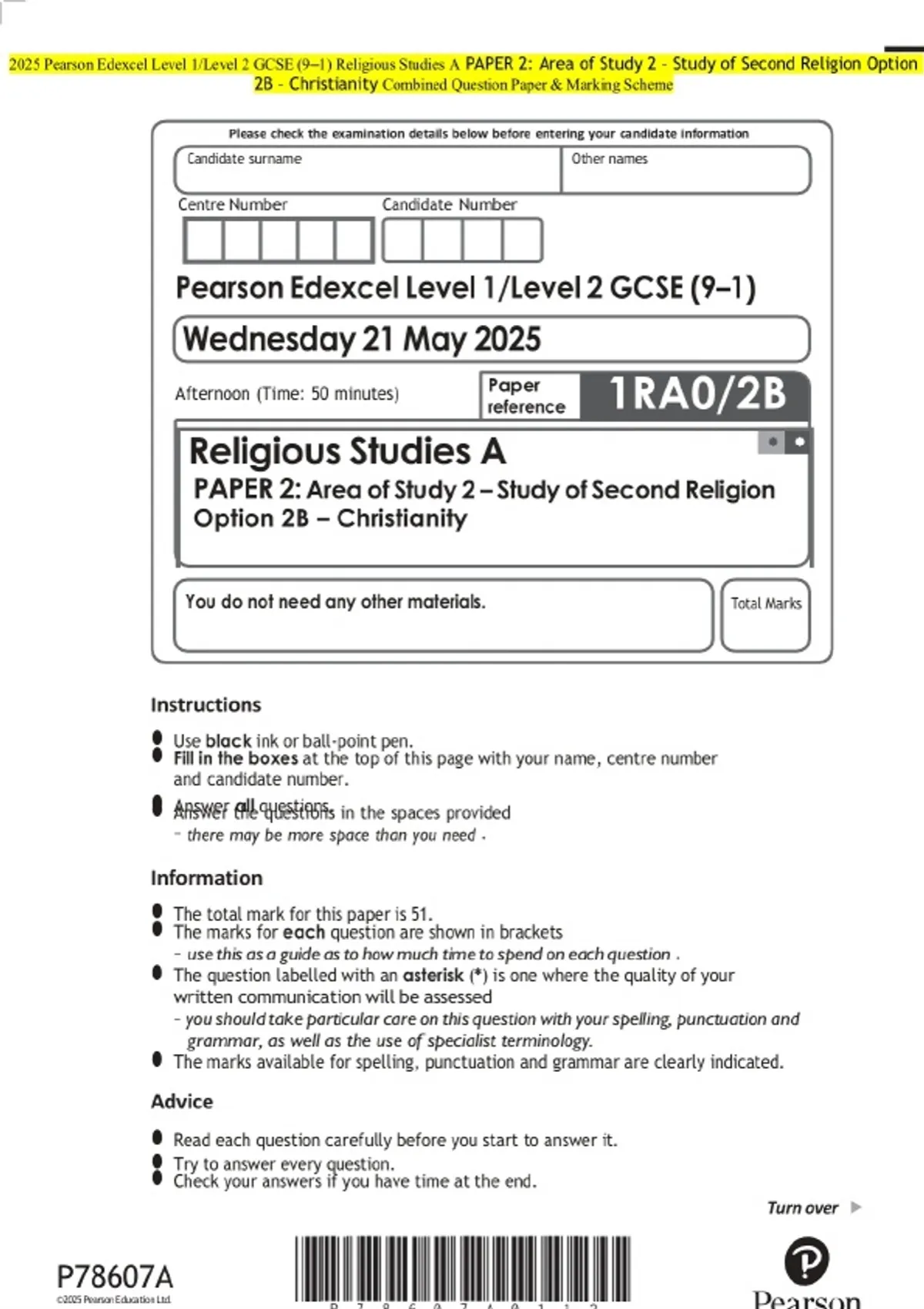 2025 Pearson Edexcel Level 1/Level 2 GCSE (9–1) Religious Studies A PAPER 2: Area of Study 2 – Study of Second Religion Option 2B – Christianity Exam Paper and marking scheme