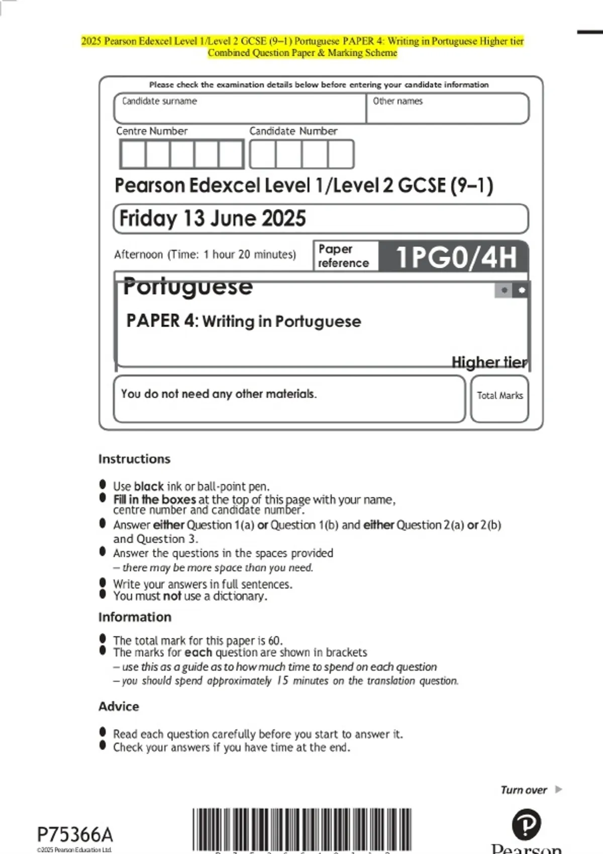 2025 Pearson Edexcel Level 1/Level 2 GCSE (9–1) Portuguese PAPER 4: Writing in Portuguese Higher tier Exam Paper and marking scheme
