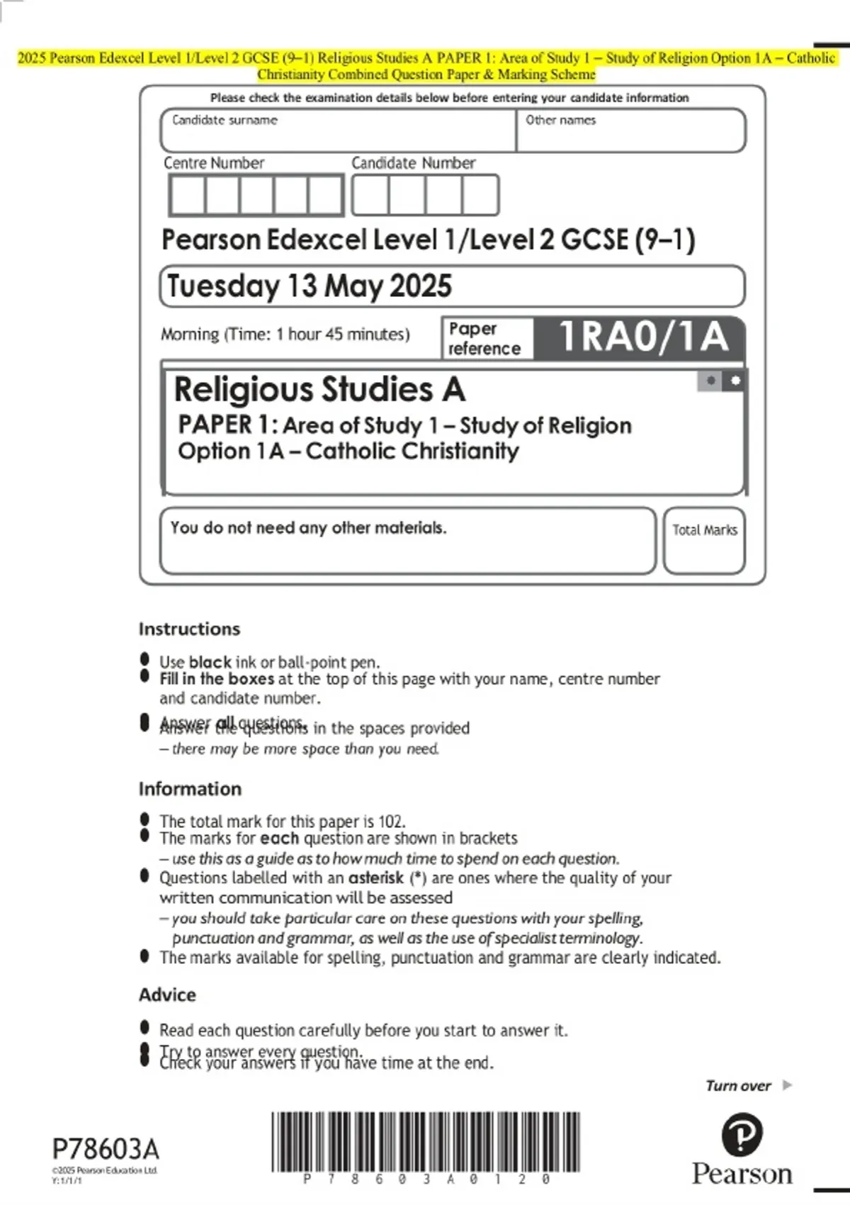 2025 Pearson Edexcel Level 1/Level 2 GCSE (9–1) Religious Studies A PAPER 1: Area of Study 1 – Study of Religion Option 1A – Catholic Christianity Exam Paper and marking scheme
