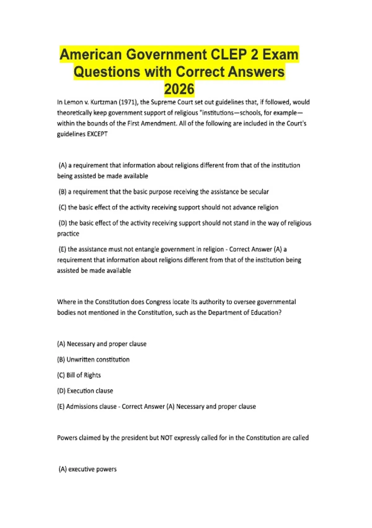 American Government CLEP 2 Exam Questions with Correct Answers 2026 In Lemon v. Kurtzman (1971), the Supreme Court set out guidelines that, if followed, would theoretically keep government support of religious "institutions—schools, for example—within the bounds of the First Amendment. All of the following are included in the Court's guidelines EXCEPT (A) a requirement that information about religions different from that of the institution being assisted be made available (B) a requirement that the basic purpose receiving the assistance be secular (C) the basic effect of the activity receiving support should not advance religion (D) the basic effect of the activity receiving support should not stand in the way of religious practice (E) the assistance must not entangle government in religion - Correct Answer (A) a requirement that information about religions different from that of the institution being assisted be made available Where in the Constitution does Congress locate its authority to oversee governmental bodies not mentioned in the Constitution, such as the Department of Education? (A) Necessary and proper clause (B) Unwritten constitution (C) Bill of Rights (D) Execution clause (E) Admissions clause - Correct Answer (A) Necessary and proper clause Powers claimed by the president but NOT expressly called for in the Constitution are called (A) executive powers