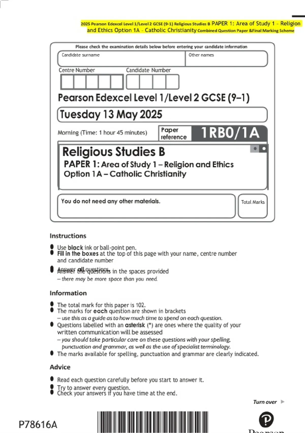 2025 Pearson Edexcel Level 1/Level 2 GCSE (9–1) Religious Studies B PAPER 1: Area of Study 1 – Religion and Ethics Option 1A – Catholic Christianity Exam Paper and marking scheme