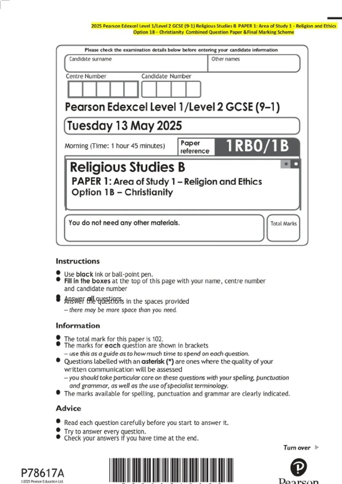 2025 Pearson Edexcel Level 1/Level 2 GCSE (9–1) Religious Studies B PAPER 1: Area of Study 1 – Religion and Ethics Option 1B – Christianity Exam Paper and marking scheme