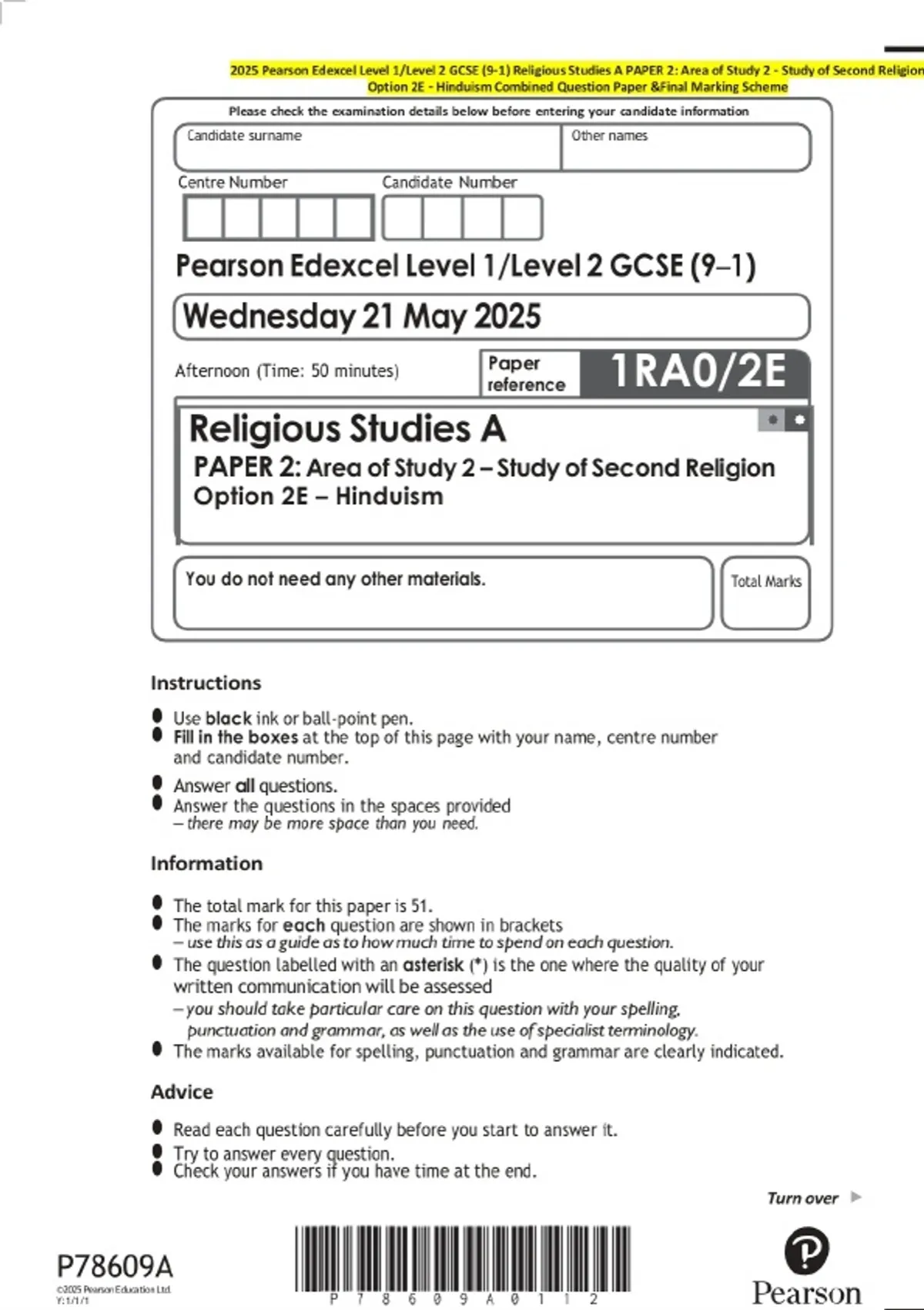2025 Pearson Edexcel Level 1/Level 2 GCSE (9–1) Religious Studies A PAPER 2: Area of Study 2 – Study of Second Religion Option 2E – Hinduism Exam Paper and marking scheme