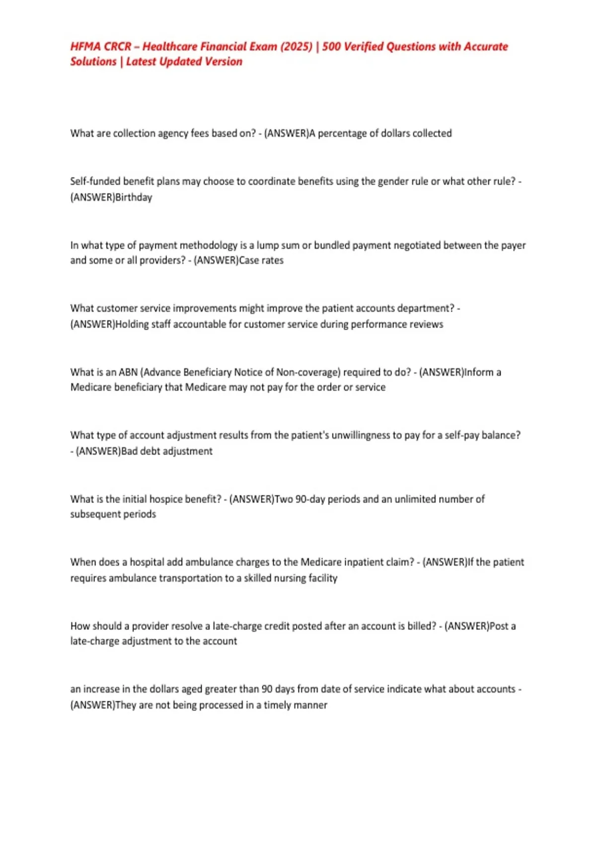 HFMA CRCR – Healthcare Financial Exam (2025) | 500 Verified Questions with Accurate Solutions | Latest Updated Version